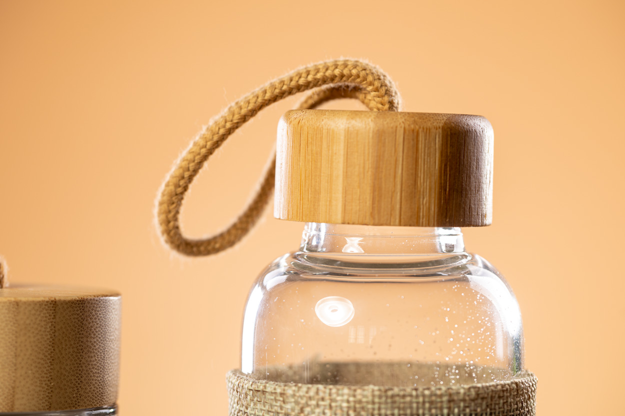 Trinkflasche aus Glas mit naturfarbener Polyesterhülle, Bambusdeckel und Trageschlaufe. Füllmenge: 500 ml. Nicht geeignet für kohlensäurehaltige Getränke.