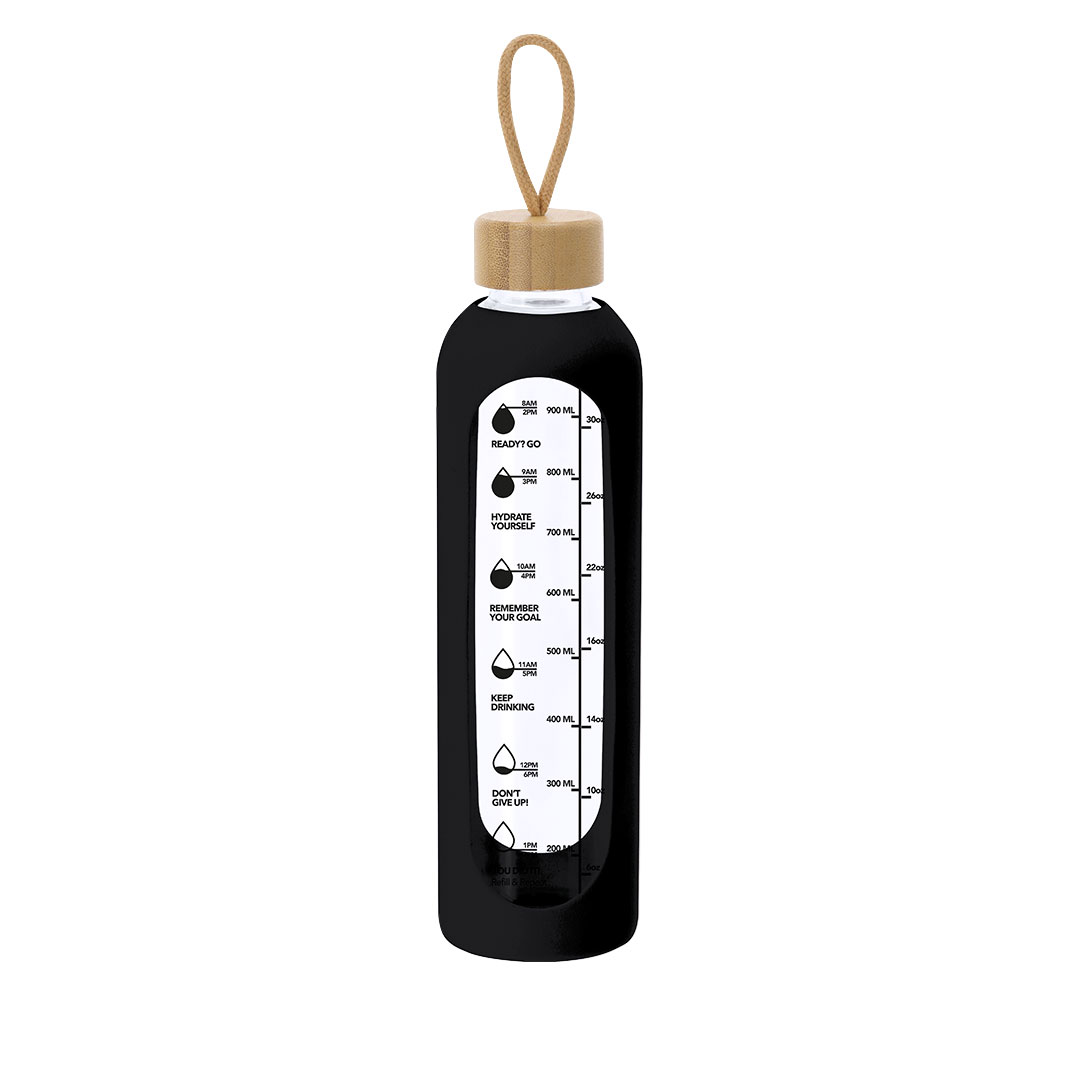 Flasche aus 1L Glas, entworfen, um eine angemessene Hydration zu fördern. Mit einer Silikonhülle, die schützt und einen bequemen und sicheren Halt bietet. Inklusive Kapazitätsanzeige in Litern und Unzen, begleitet von motivierenden Sätzen, die dazu inspirieren, eine angemessene Hydration täglich aufrechtzuerhalten. Der Deckel, aus Bambus gefertigt, hat eine praktische Kordel für einfachen Transport. BPA-frei.