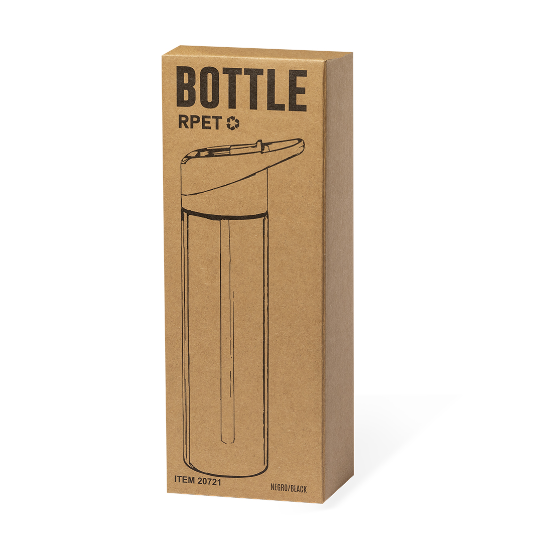 RPET-Flasche mit 600 ml Fassungsvermögen. BPA-frei, mit leicht zu öffnendem System, Spender mit Strohhalm (im Lieferumfang enthalten) und passendem Tragegriff. Erhältlich in einer Auswahl an leuchtenden Farben und präsentiert in einer attraktiven Kraftpapier-Designbox. Das RPET-Material wird aus recyceltem Kunststoff hergestellt, um die Wiederverwendung von Kunststoffabfällen zu fördern und zur Nachhaltigkeit des Planeten beizutragen.