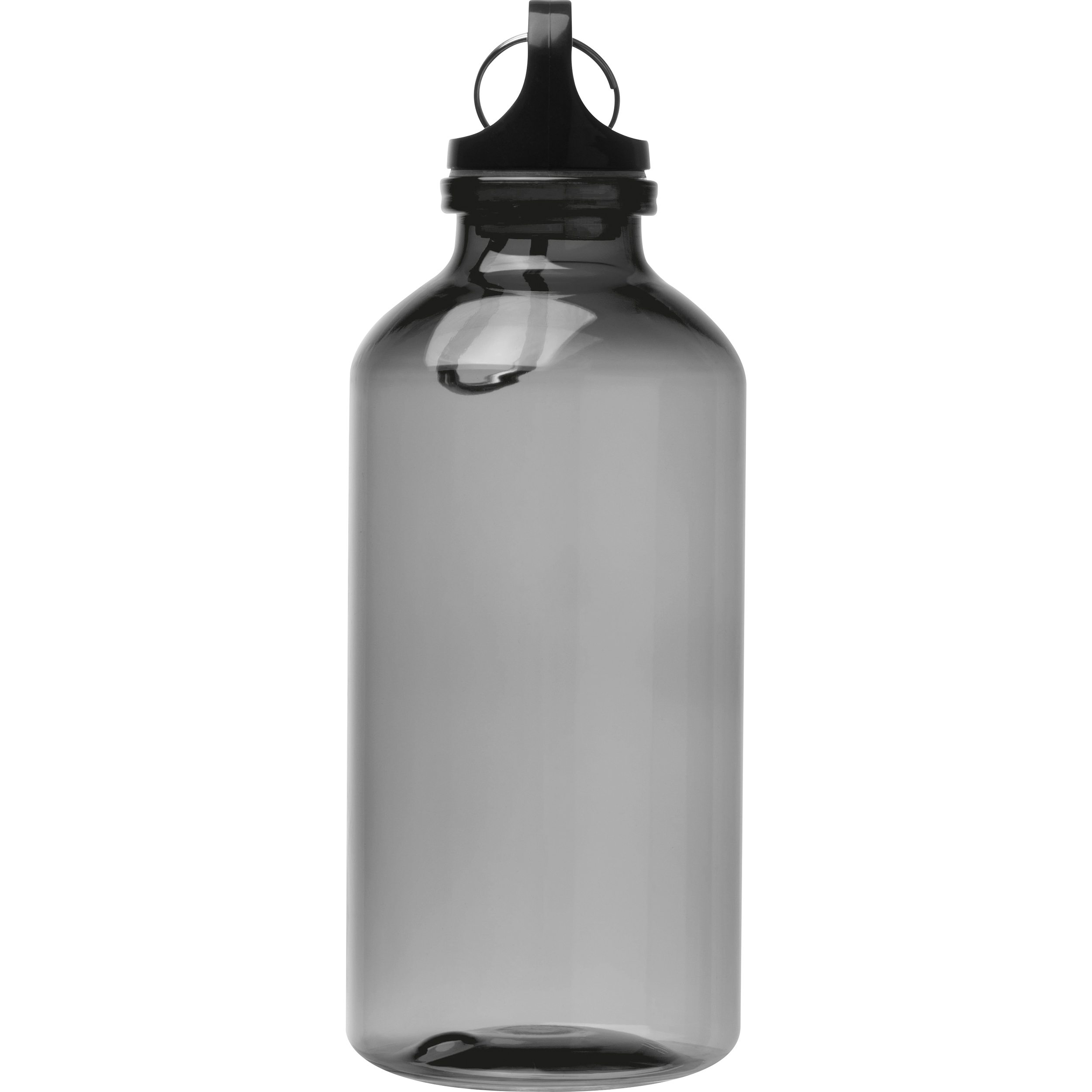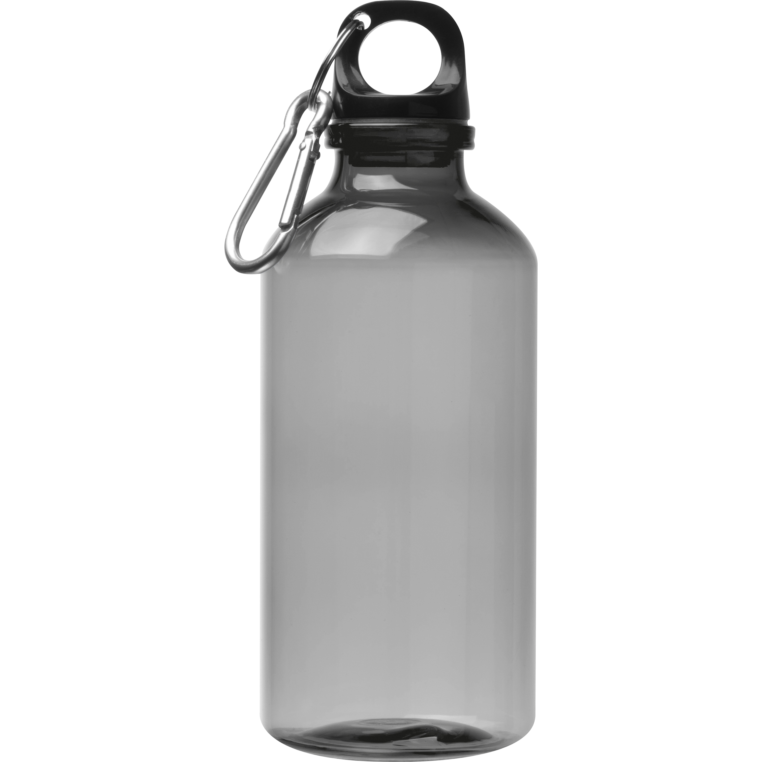 Trinkflasche aus PET mit auslaufsicherem Verschluss, Karabinerhaken und einem Füllvermögen von 400 ml. Die Werbung wird auf die Flasche gedruckt.