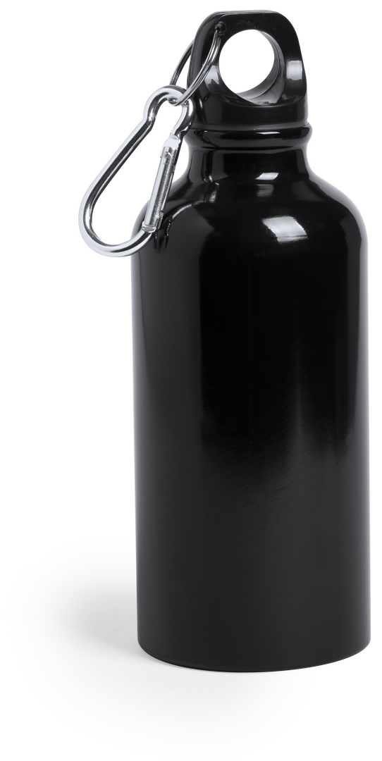 Trinkflasche mit 400 ml Fassungsvermögen und Aluminiumgehäuse in verschiedenen leuchtenden Farben. Mit aufschraubbarem Sicherheitsverschluss und Metallkarabiner für den Transport. Präsentiert in einer attraktiven Designbox.