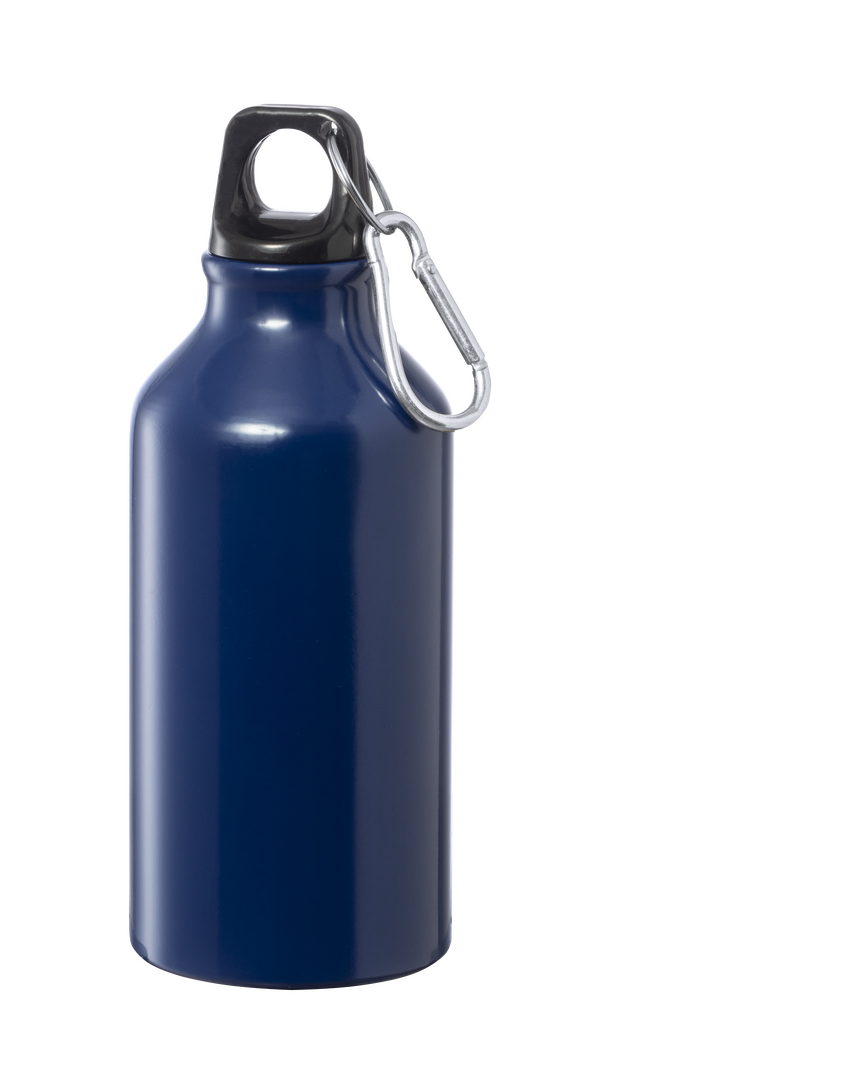 Trinkflasche mit 400 ml Fassungsvermögen und Aluminiumgehäuse in verschiedenen leuchtenden Farben. Mit aufschraubbarem Sicherheitsverschluss und Metallkarabiner für den Transport. Präsentiert in einer attraktiven Designbox.