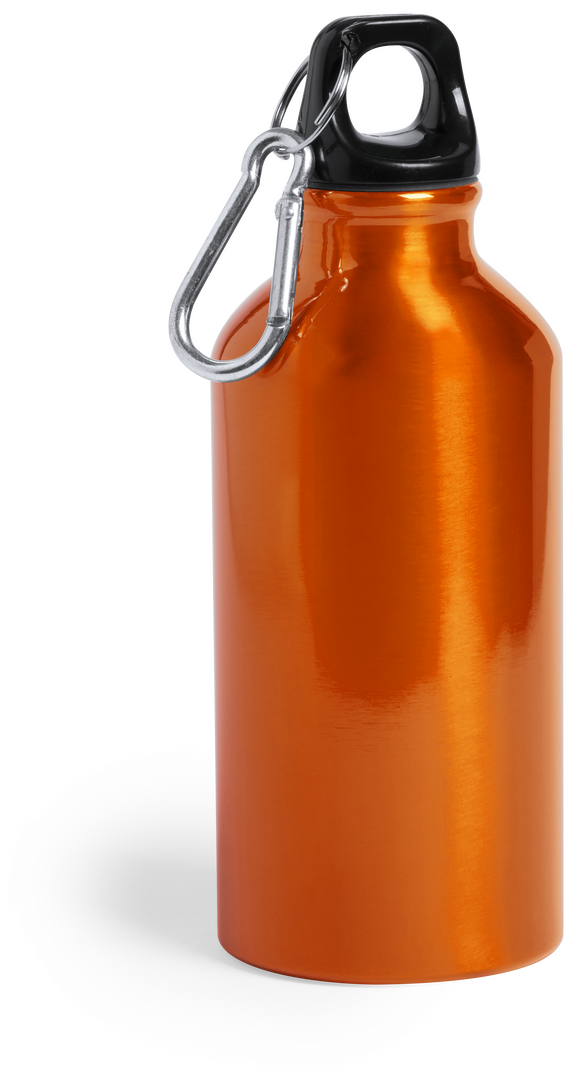 Trinkflasche mit 400 ml Fassungsvermögen und Aluminiumgehäuse in verschiedenen leuchtenden Farben. Mit aufschraubbarem Sicherheitsverschluss und Metallkarabiner für den Transport. Präsentiert in einer attraktiven Designbox.