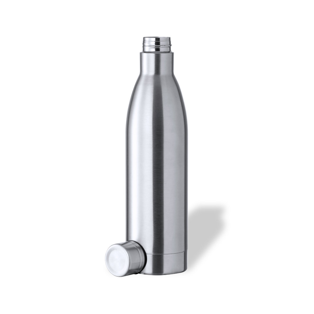 Flasche mit 1 Liter Fassungsvermögen, aus rostfreiem Stahl mit glänzender Oberfläche. Mit passendem Schraubverschluss aus Edelstahl, BPA-frei. Präsentiert in individueller Kraft-Design-Box. Gebrauchsanweisung in Englisch und Spanisch erhältlich.