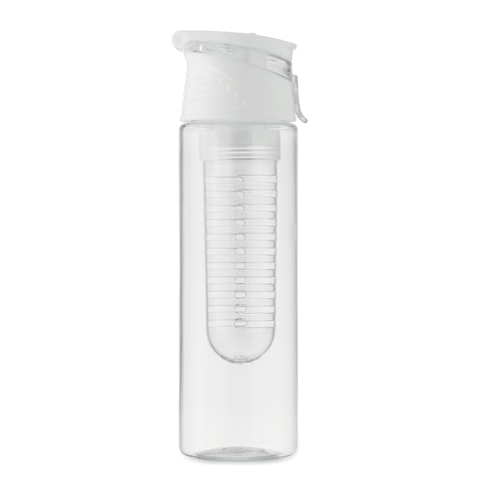 Trinkflasche aus RPET mit entnehmbarem Frucht-Aromafach. Henkel und auslaufsicherer Deckel. Füllmenge: 500 ml.