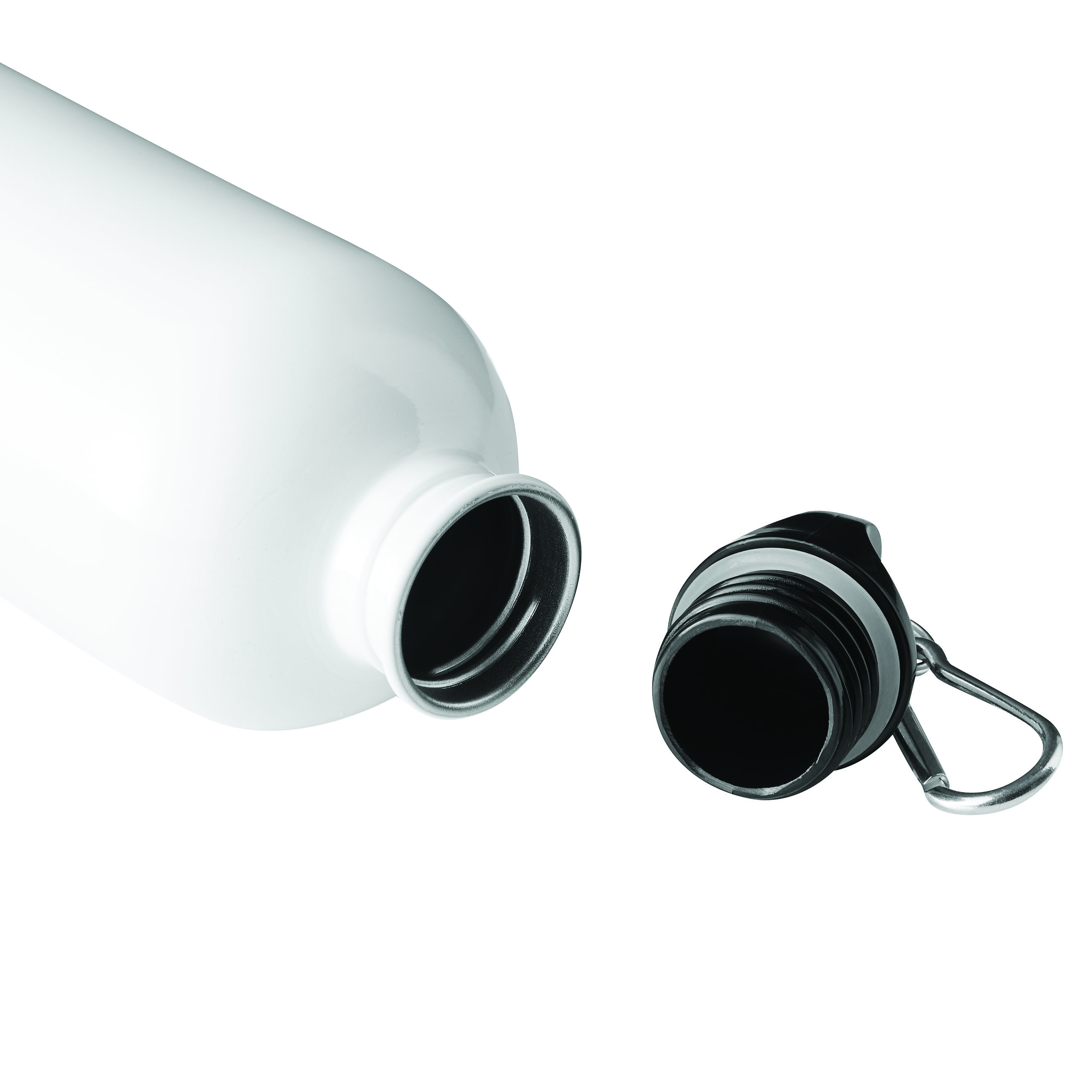 Trinkflasche SMALLTRANSIT, einwandig: aus recyceltem Edelstahl, schwarzer Kunststoff-Deckel mit sicherem Schraubverschluss, Silikon-Dichtring, Tragegriff, Schlüsselring und Karabinerhaken (der Karabiner ist NICHT als Sicherung beim Klettern geeignet), Füllmenge ca. 550 ml