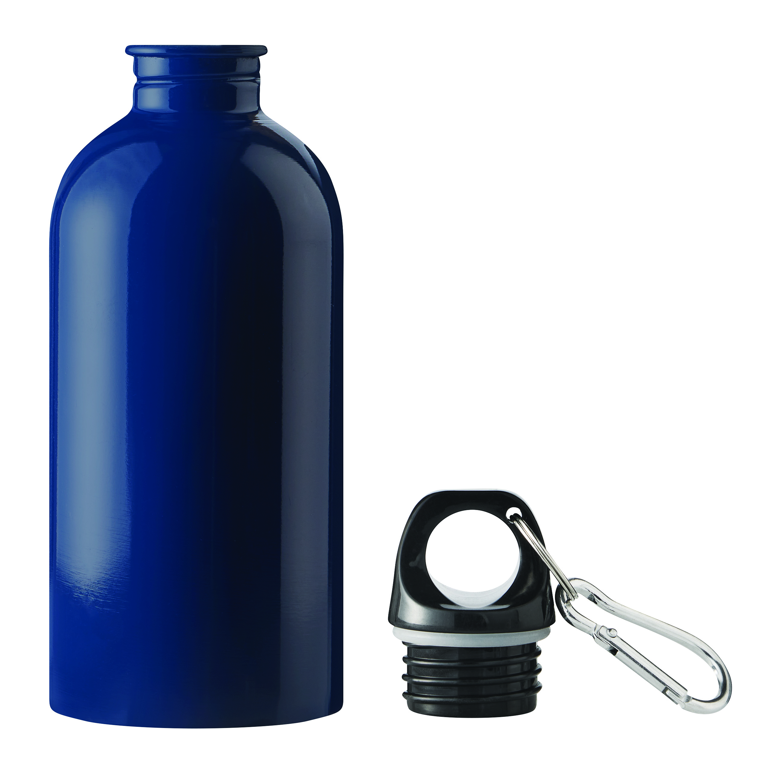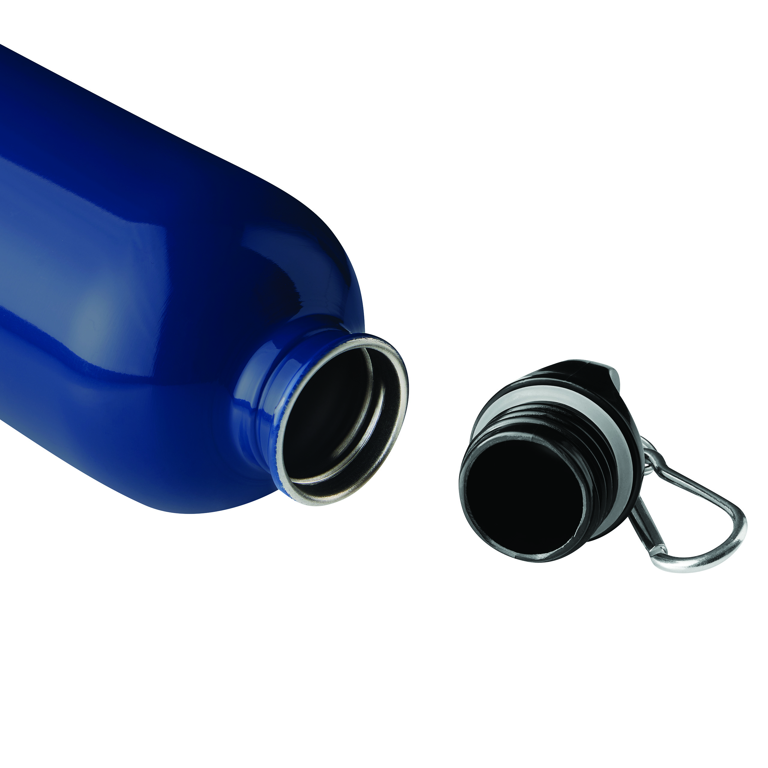 Trinkflasche SMALLTRANSIT, einwandig: aus recyceltem Edelstahl, schwarzer Kunststoff-Deckel mit sicherem Schraubverschluss, Silikon-Dichtring, Tragegriff, Schlüsselring und Karabinerhaken (der Karabiner ist NICHT als Sicherung beim Klettern geeignet), Füllmenge ca. 550 ml