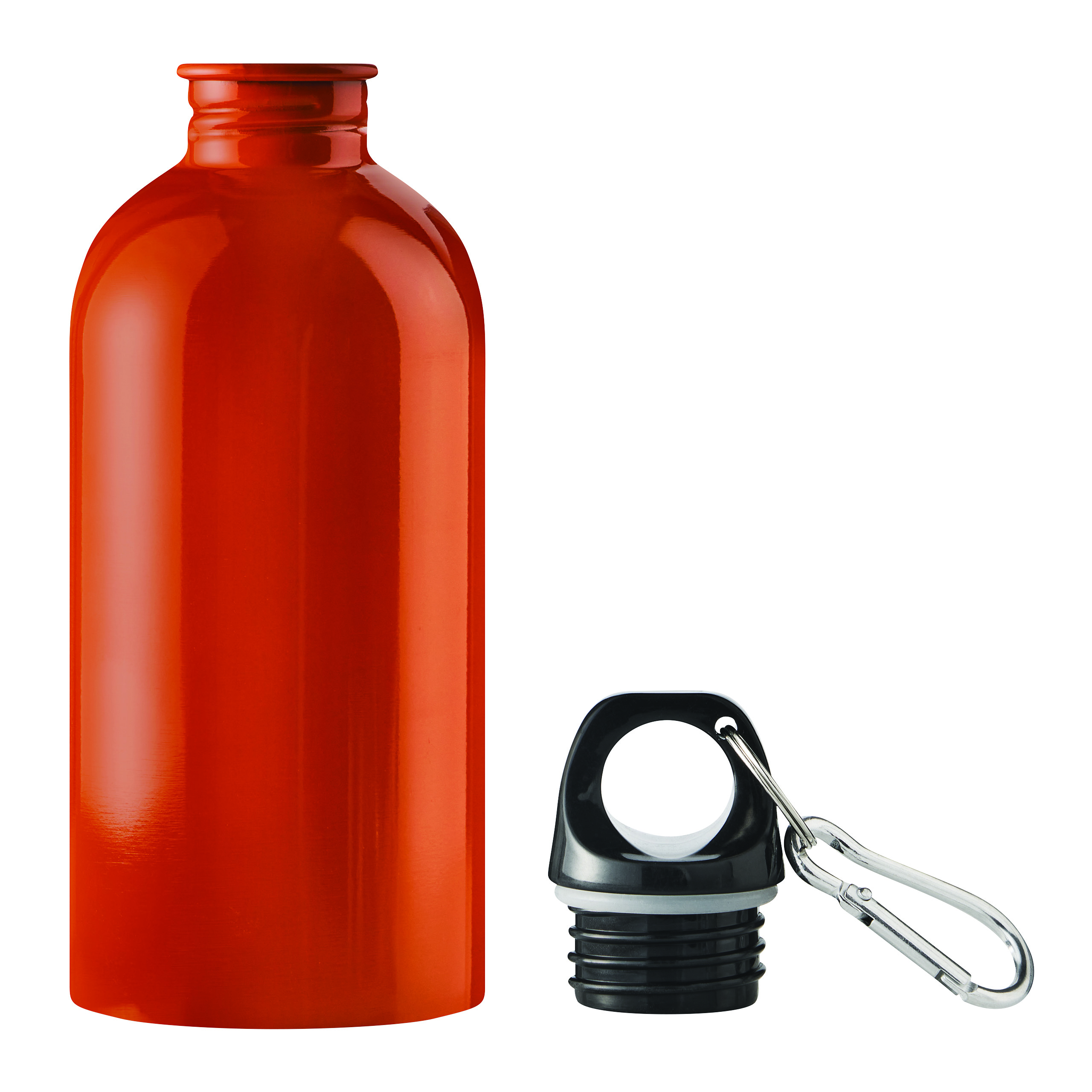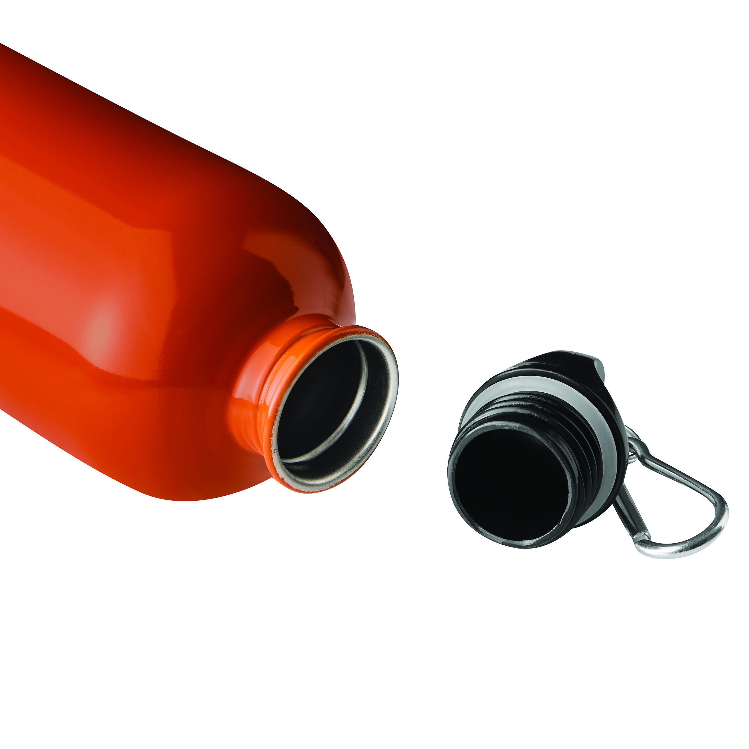 Trinkflasche SMALLTRANSIT, einwandig: aus recyceltem Edelstahl, schwarzer Kunststoff-Deckel mit sicherem Schraubverschluss, Silikon-Dichtring, Tragegriff, Schlüsselring und Karabinerhaken (der Karabiner ist NICHT als Sicherung beim Klettern geeignet), Füllmenge ca. 550 ml