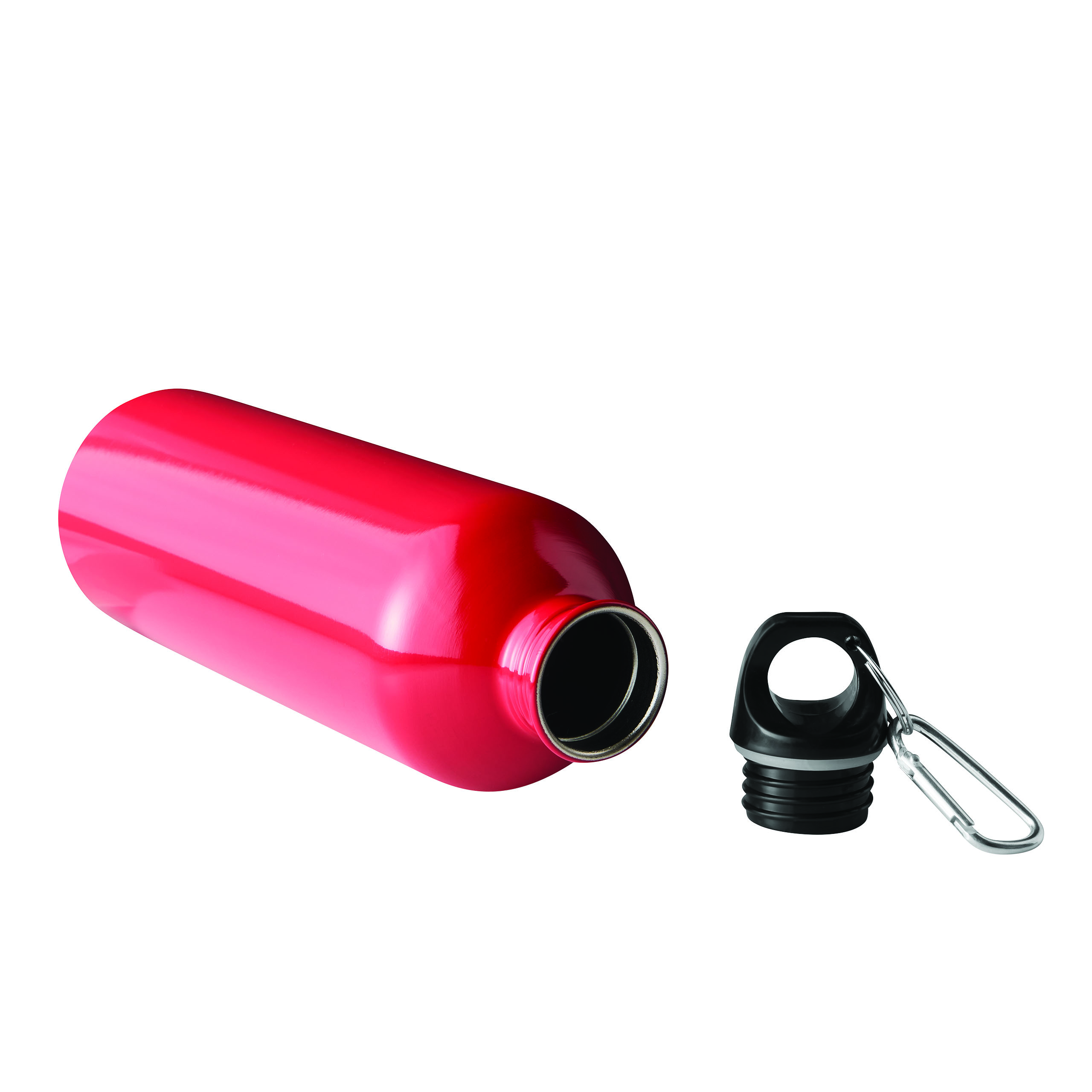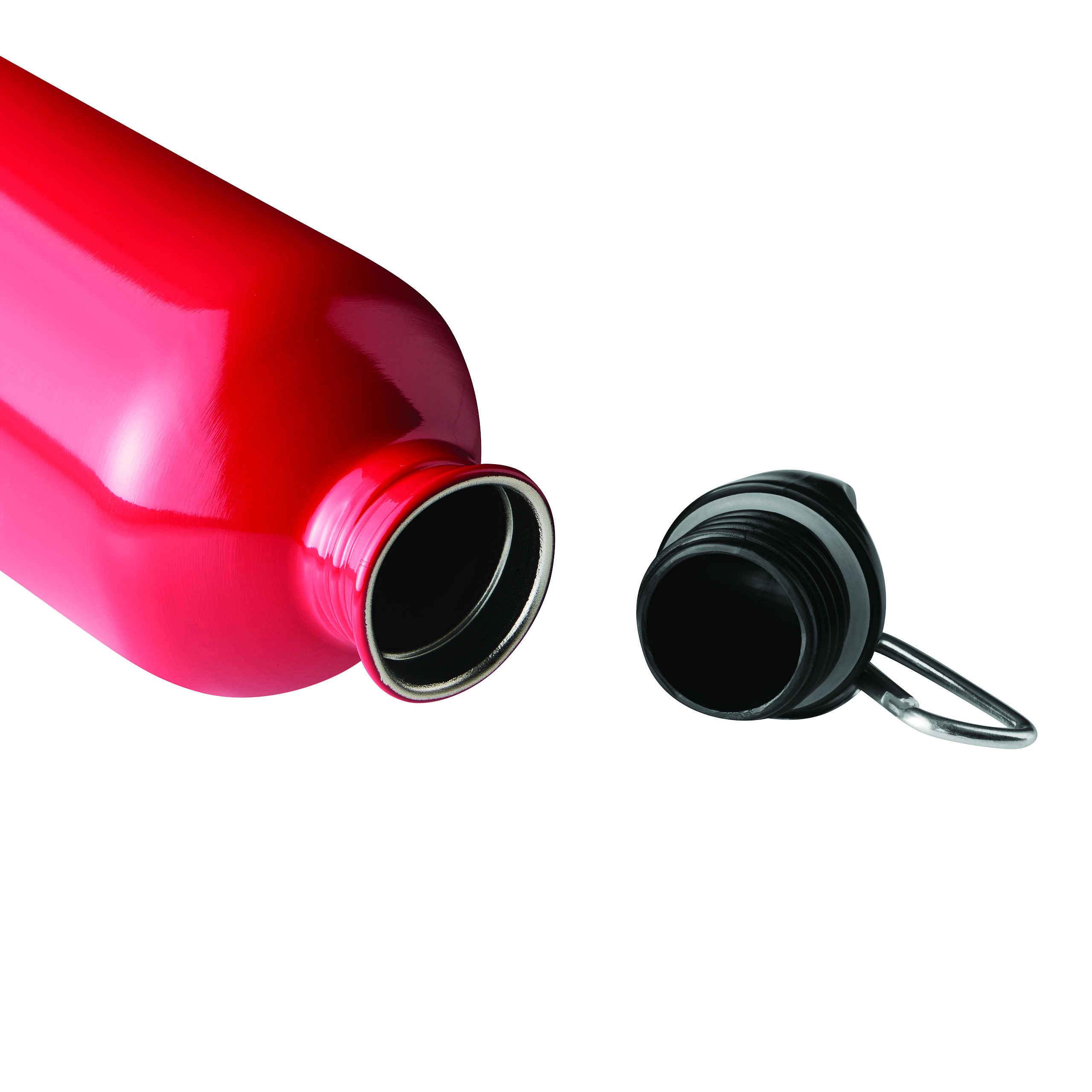 Trinkflasche STEELTRANSIT, einwandig: aus recyceltem Edelstahl, schwarzer Kunststoff-Deckel mit sicherem Schraubverschluss, Silikon-Dichtring, Tragegriff, Schlüsselring und Karabinerhaken (der Karabiner ist NICHT als Sicherung beim Klettern geeignet), Füllmenge ca. 750 ml