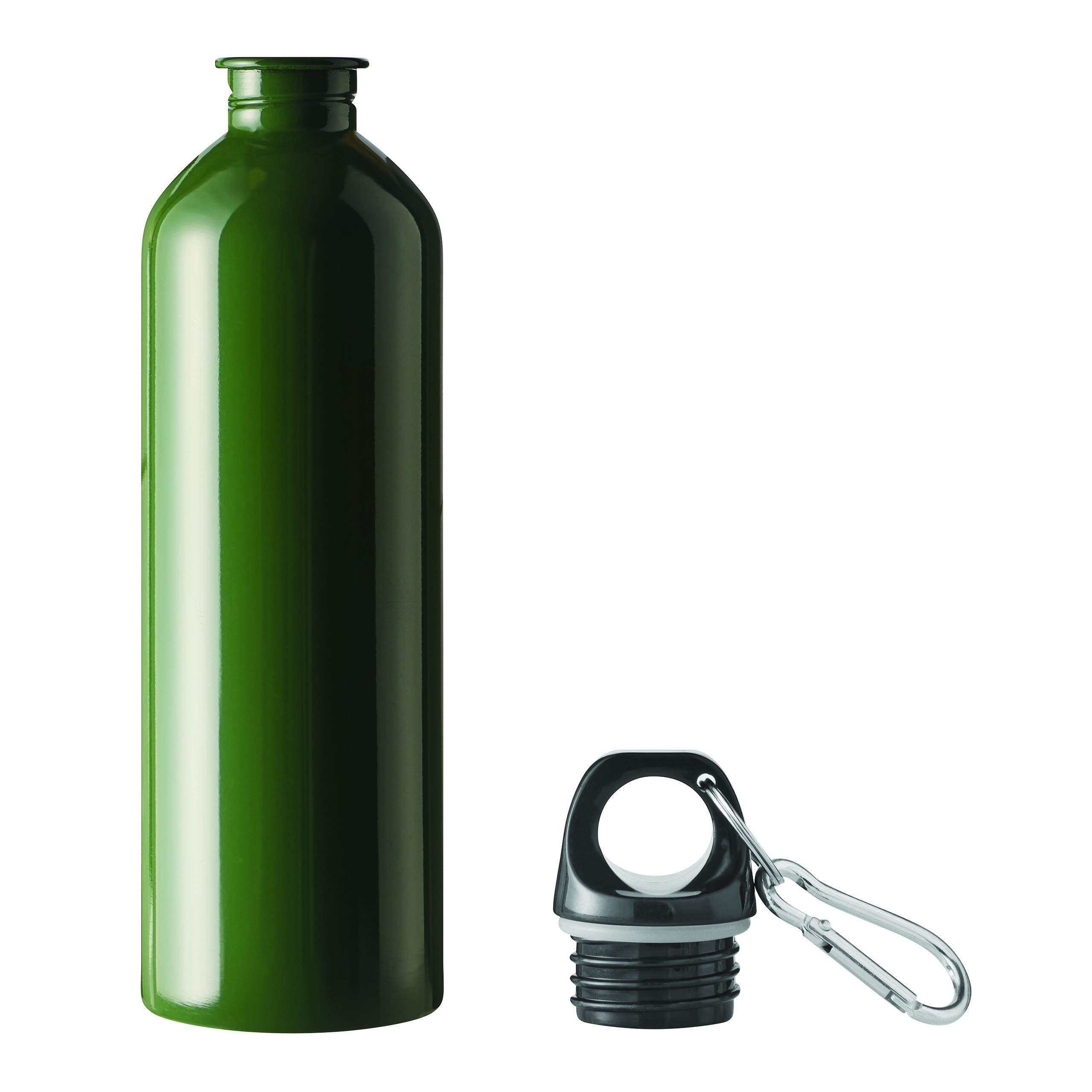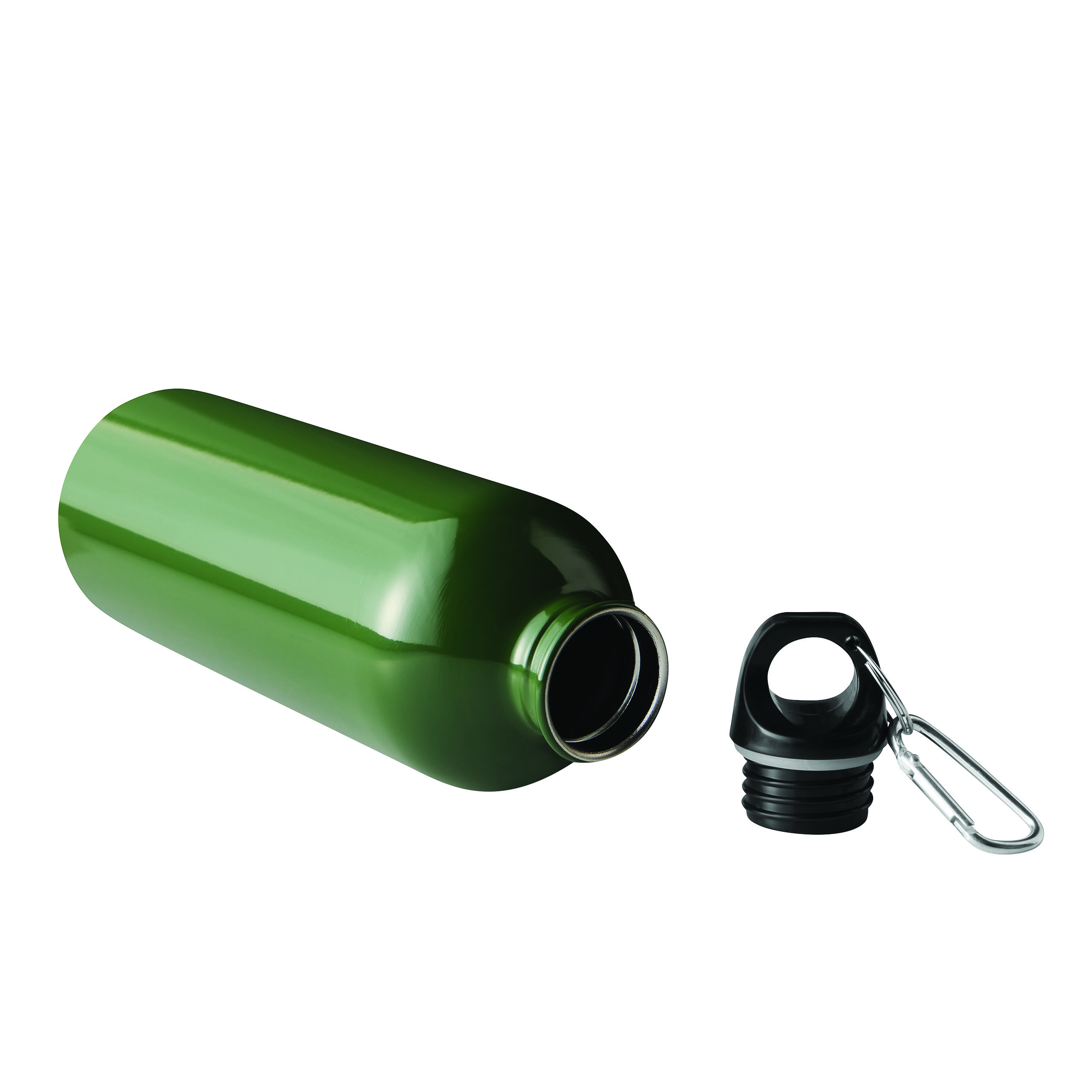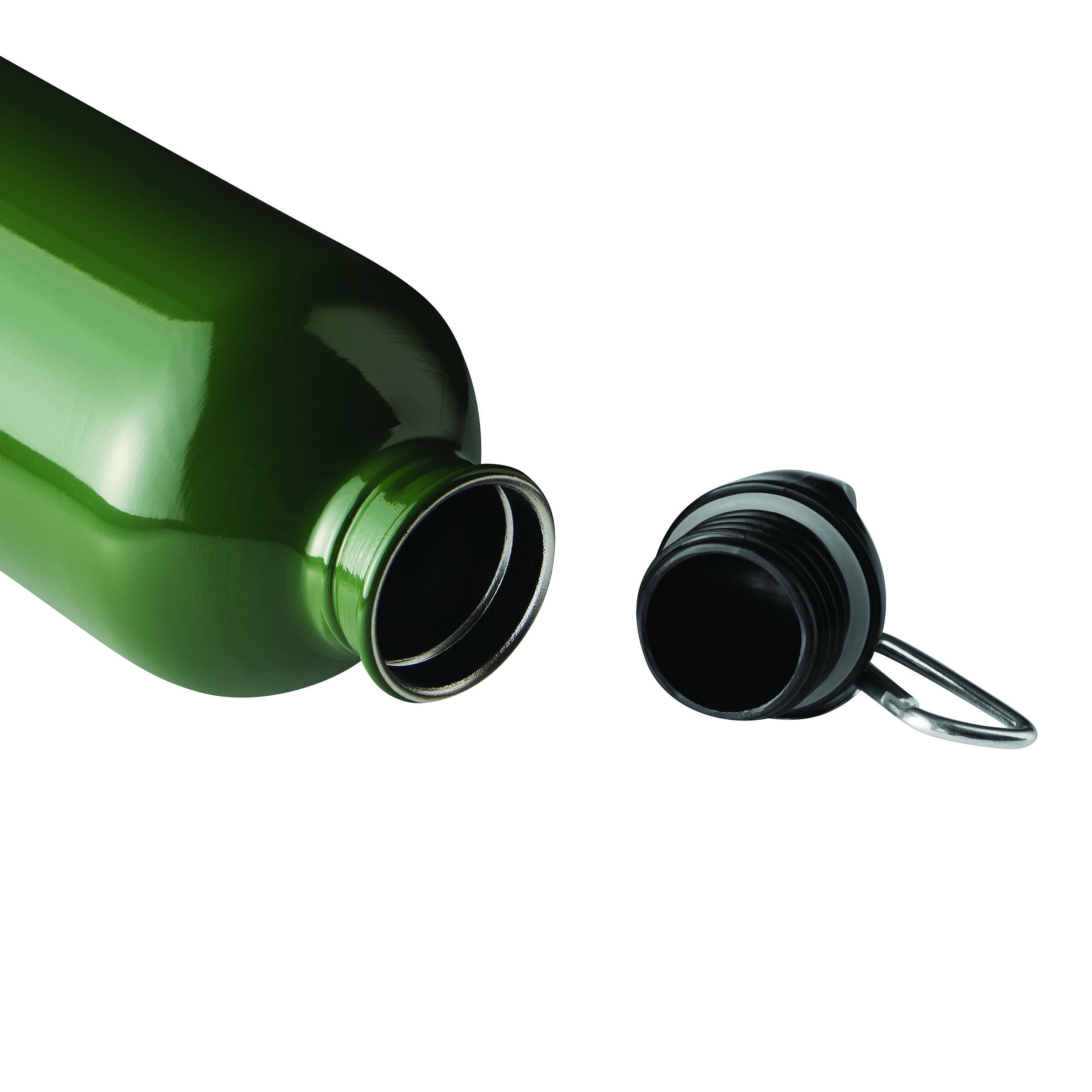 Trinkflasche STEELTRANSIT, einwandig: aus recyceltem Edelstahl, schwarzer Kunststoff-Deckel mit sicherem Schraubverschluss, Silikon-Dichtring, Tragegriff, Schlüsselring und Karabinerhaken (der Karabiner ist NICHT als Sicherung beim Klettern geeignet), Füllmenge ca. 750 ml