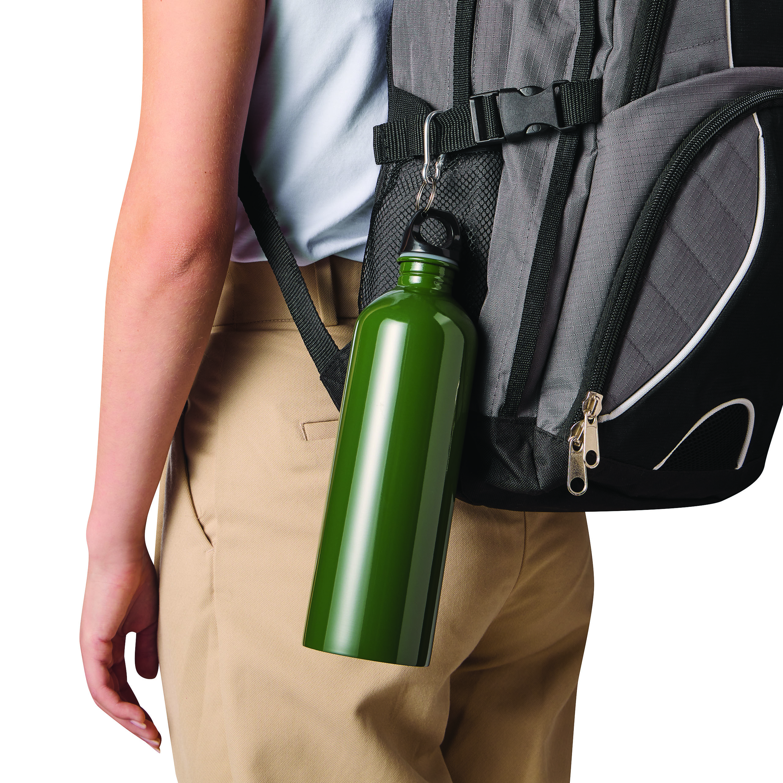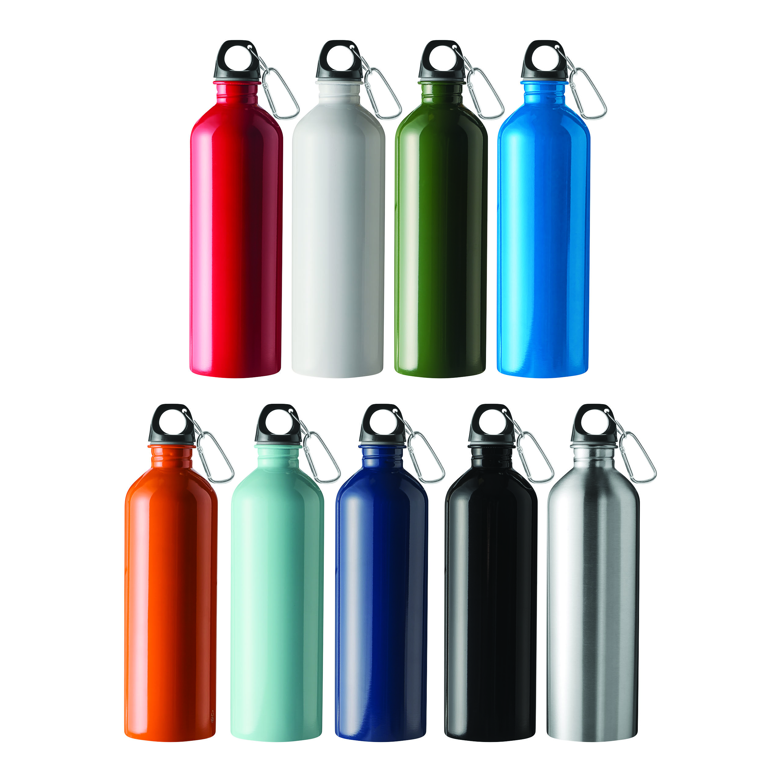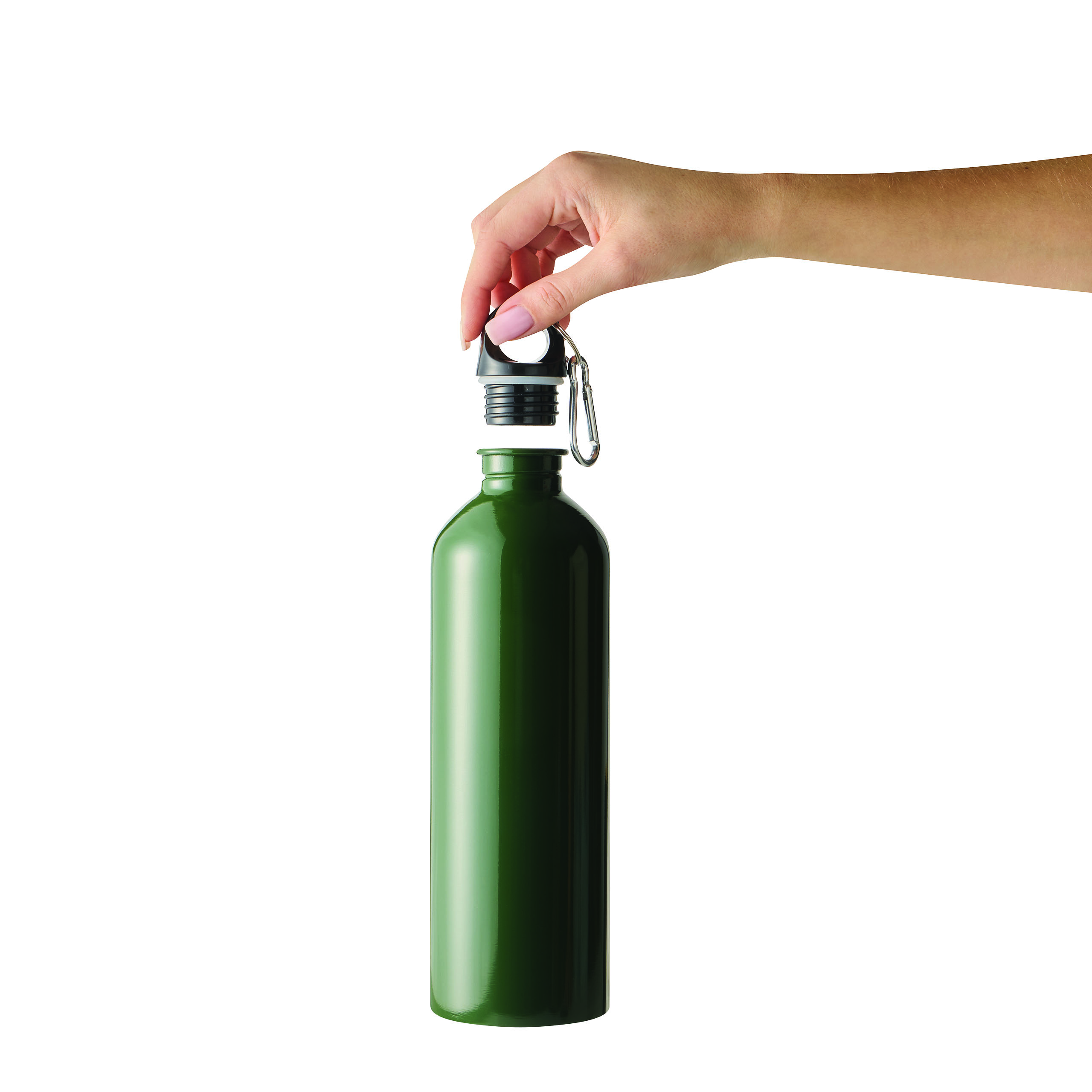 Trinkflasche STEELTRANSIT, einwandig: aus recyceltem Edelstahl, schwarzer Kunststoff-Deckel mit sicherem Schraubverschluss, Silikon-Dichtring, Tragegriff, Schlüsselring und Karabinerhaken (der Karabiner ist NICHT als Sicherung beim Klettern geeignet), Füllmenge ca. 750 ml