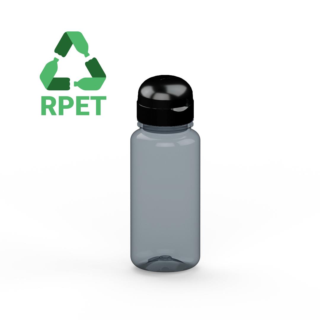 Praktische und geschmacksneutrale Trinkflasche aus recyceltem PET mit schickem Deckel. Die große Öffnung ermöglicht ein leichtes Befüllen und Reinigen der Flasche. Der kindgerechte Verschluss ist leicht zu öffnen. Auslaufsicher bei nicht kohlensäurehaltigen Getränken. Füllvolumen: 0,4 Liter.