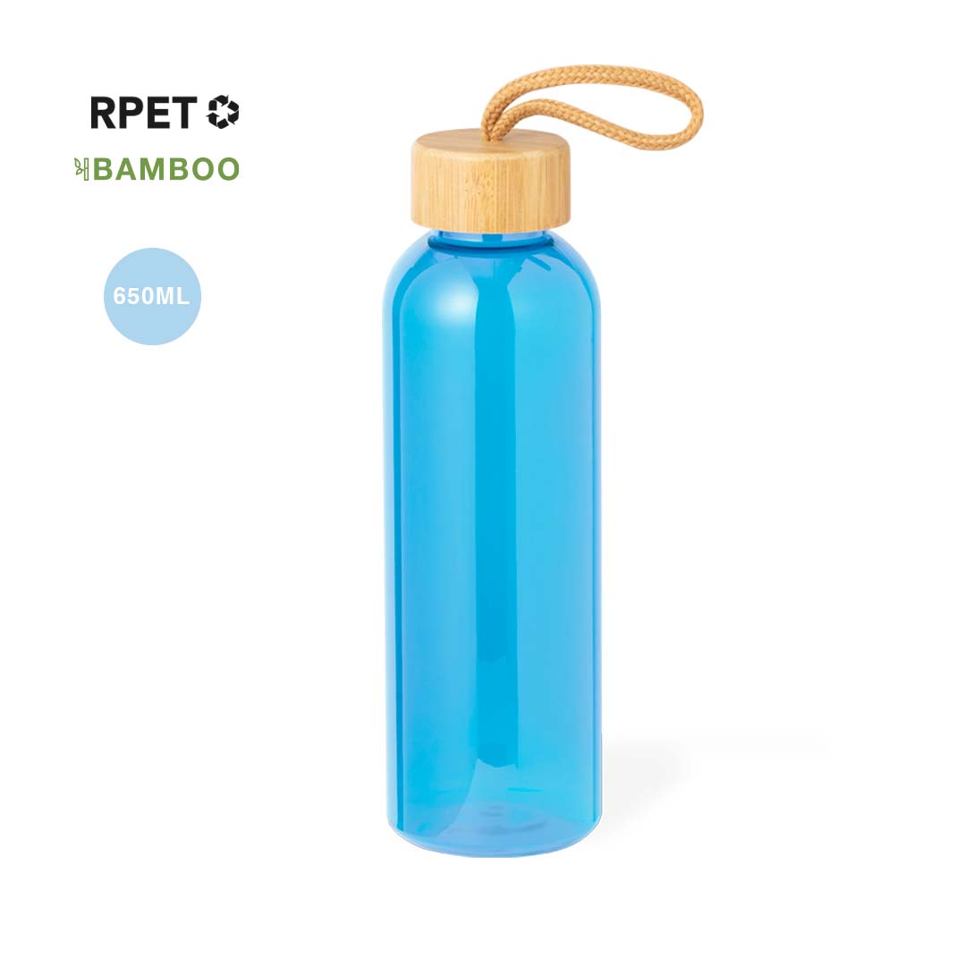 Flasche aus RPET mit einem Fassungsvermögen von 650 ml, BPA-frei. Schraubverschluss aus Bambus, mit geflochtener Trageschnur. Erhältlich in vielen Farben und einzeln verpackt in einer Papiertüte.