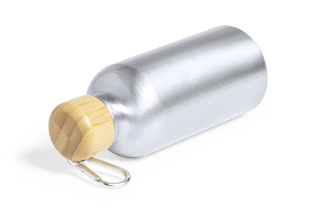 Flasche der Linie Natur mit einem Fassungsvermögen von 400 ml. Aluminium-Körper mit mattem Finish und Bambus-Deckel mit passender Farbe Karabiner für Portabilität. BPA-frei und in einer attraktiven Öko-Design-Box präsentiert.