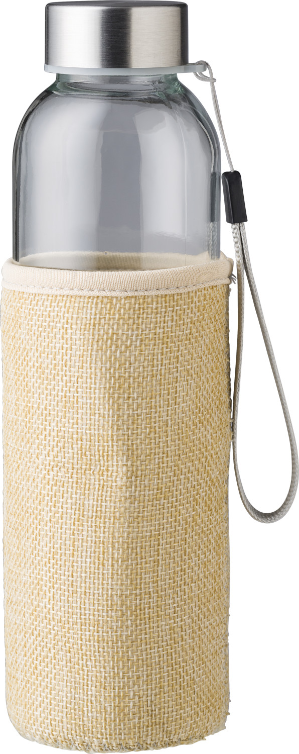 Trinkflasche aus Glas (500 ml) mit Edelstahldeckel und Jutebeutel mit Handgelenkband. Verpackt im Geschenkkarton.