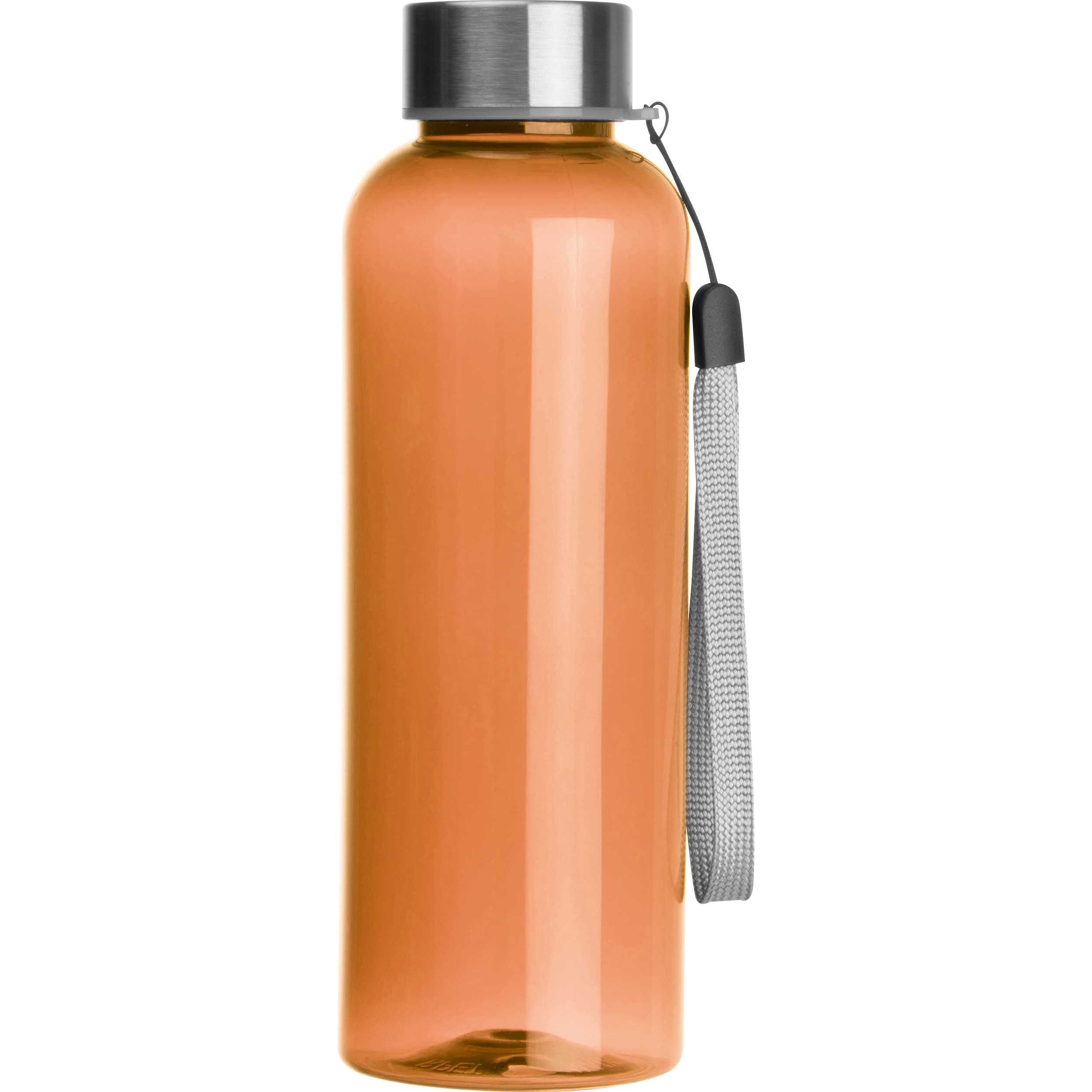 Trinkflasche aus Kunststoff (PET) mit Edelstahlverschluss, Handschlaufe und einem Füllvermögen von 500ml. Die Werbung wird auf den Deckel graviert.