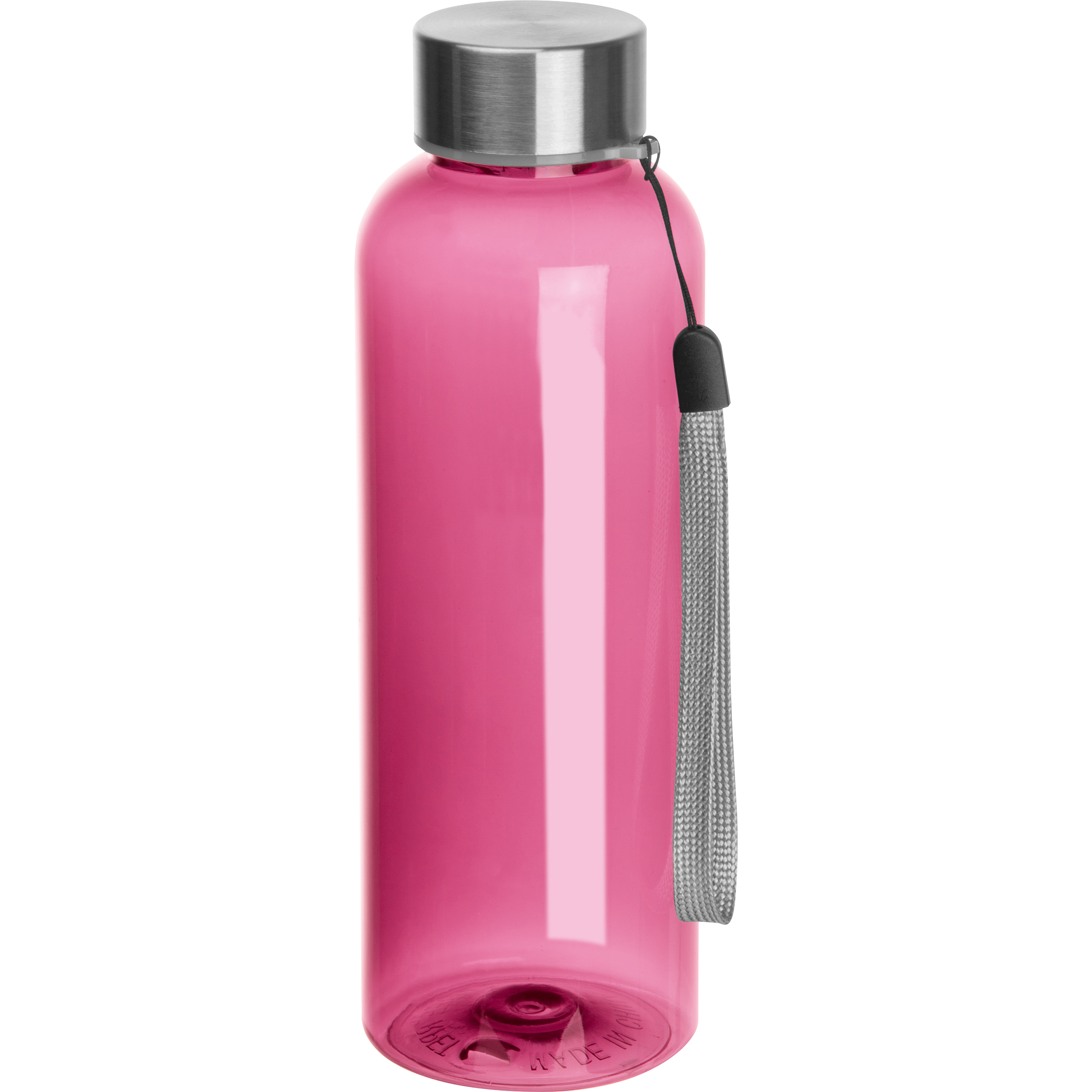 Trinkflasche aus Kunststoff (PET) mit Edelstahlverschluss, Handschlaufe und einem Füllvermögen von 500ml. Die Werbung wird auf den Deckel graviert.