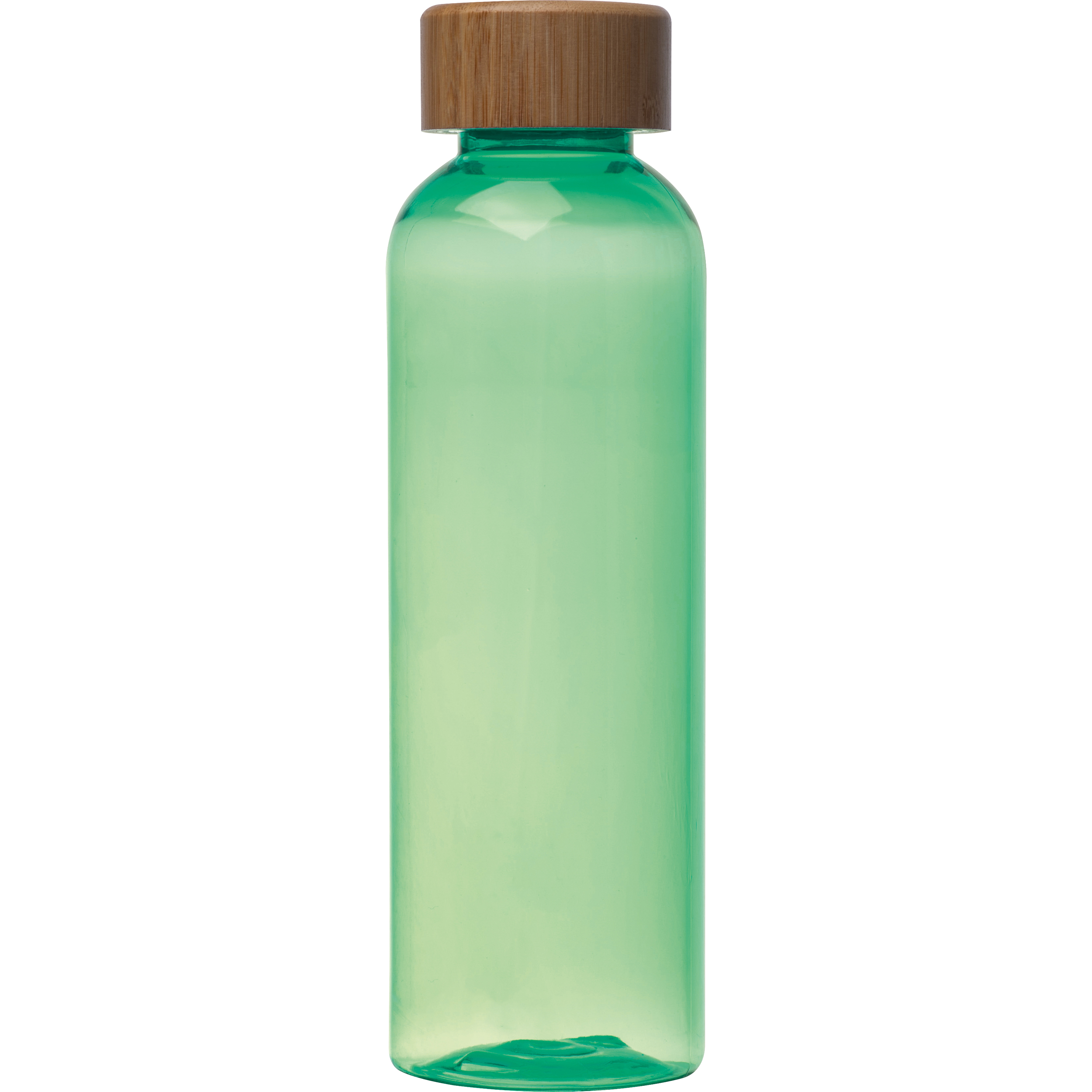 Trinkflasche aus Kunststoff (PET) mit Bambusdeckel und einem Füllvermögen von 500ml. Die Werbung wird auf den Deckel graviert.