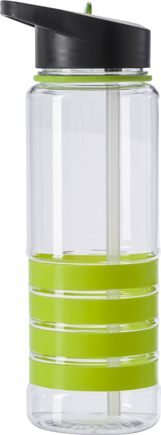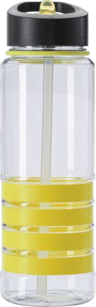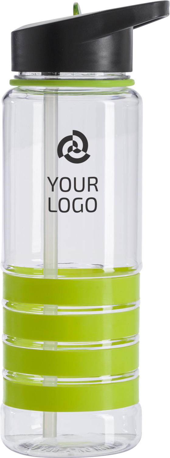 Beschreibung: Trinkflasche 'Grip' aus Tritan (ca. 700 ml) mit einklappbarem Trinkverschluss, sowie Strohhalm. Die transparente Trinkflasche hat vier Silikonringe.