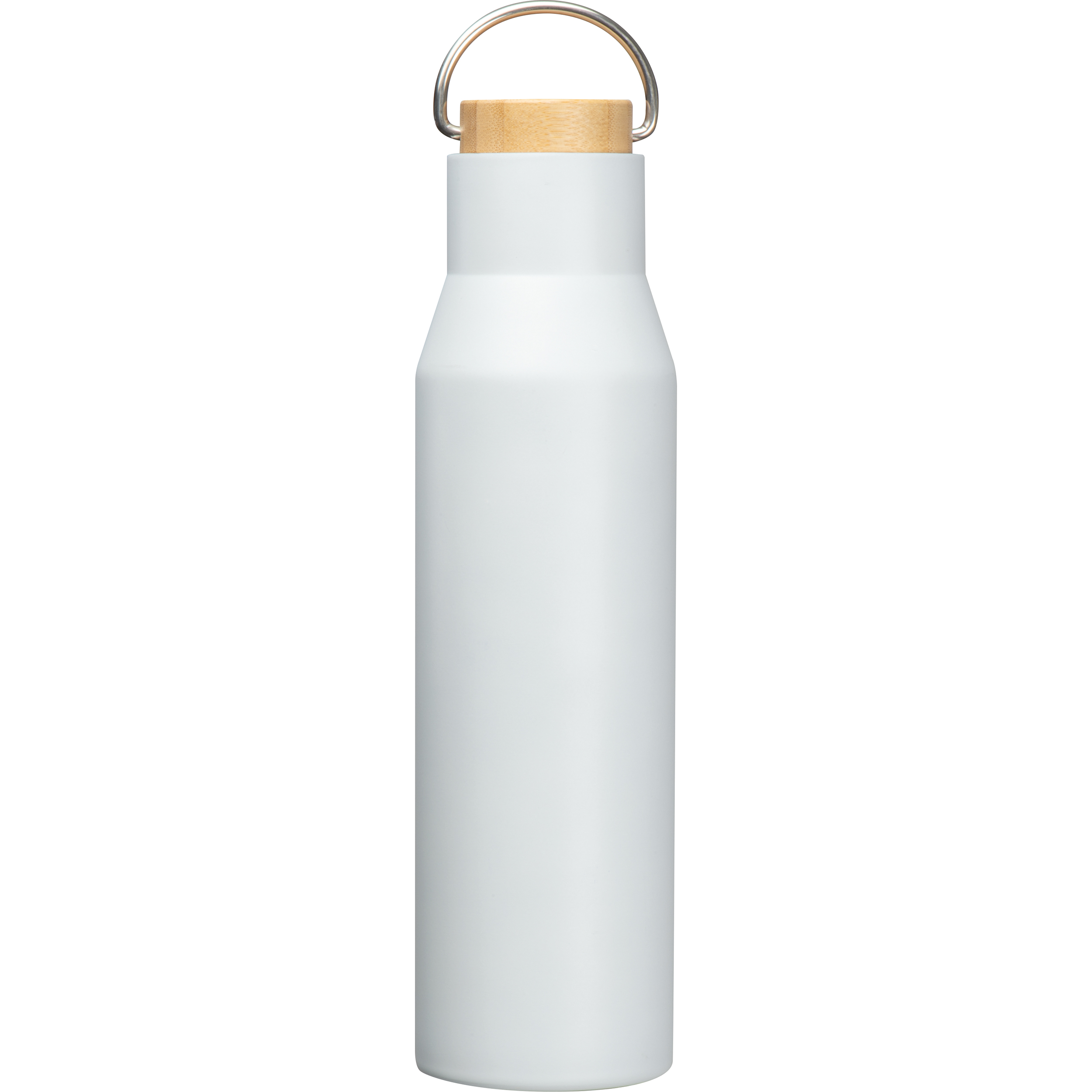 Trinkflasche aus recyceltem Edelstahl mit Vakuum-Isolierung, Bambusdeckel mit Henkel und 550ml Fassungsvermögen. Ihre Werbung gravieren wir auf die Flasche.