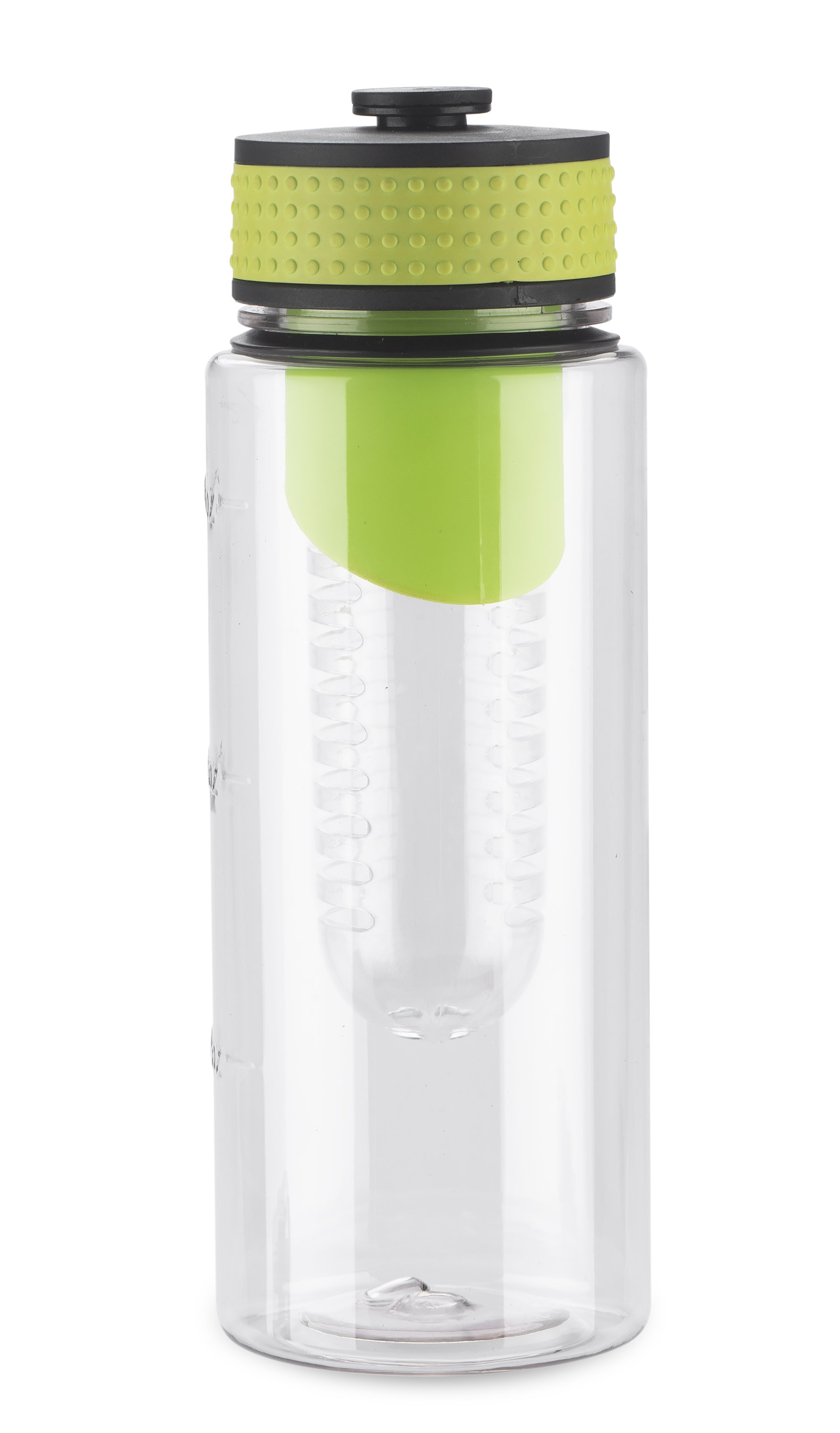 Trinkflasche mit Fruchteinsatz. Fassungsvermögen 800 ml. Hergestellt aus Tritan. Verpackt in einem biologisch abbaubaren Beutel.