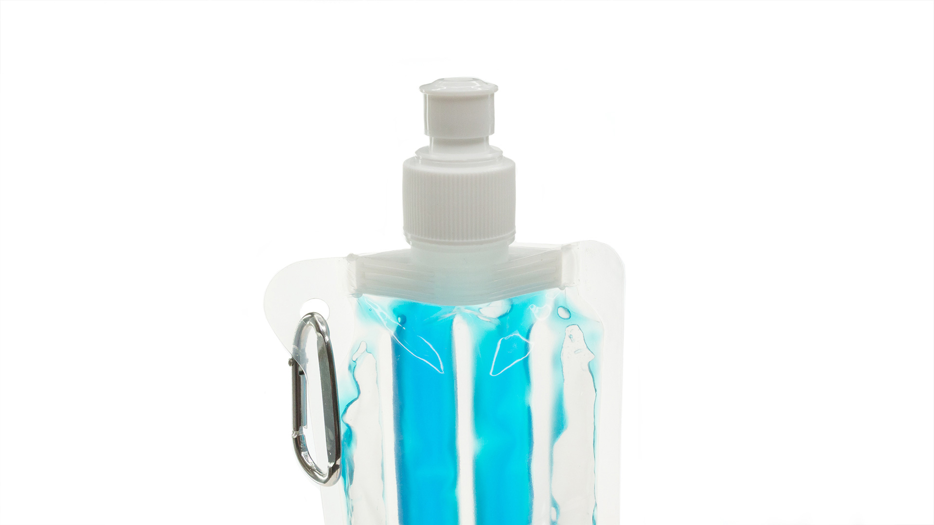Trinkflasche mit 400 ml Fassungsvermögen aus transparentem PET mit flüssigem Kühlmittel in lebendigen Farben. Mit Sicherheitsverschluss und Metallkarabiner.