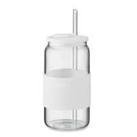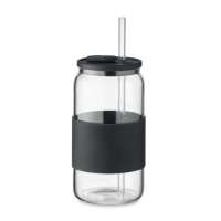 Trinkglas aus hochwertigem Borosilikatglas mit Deckel und Griffteil aus Silikon. Inkl. Trinkhalm aus Borosilikatglas. Füllmenge: 550 ml.
