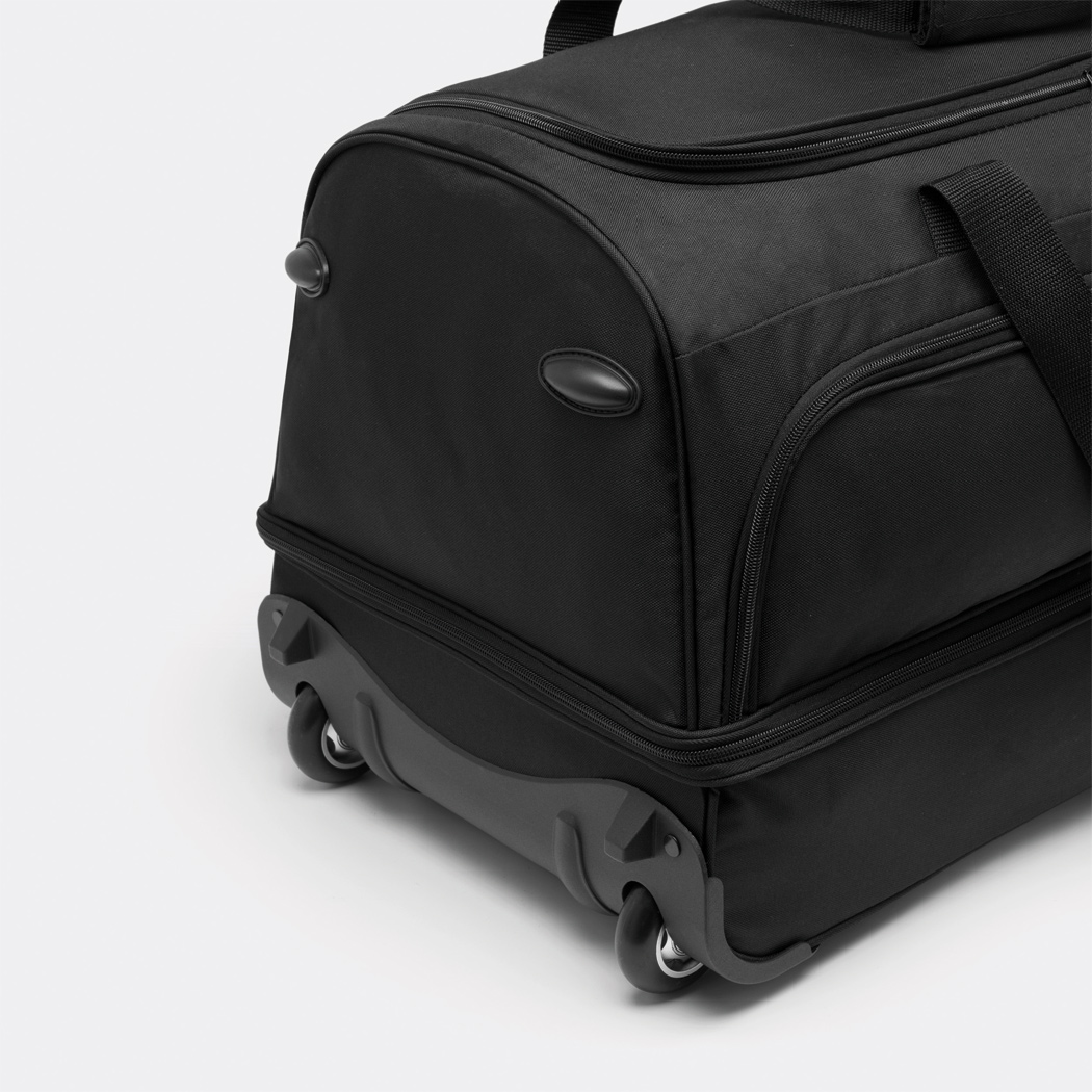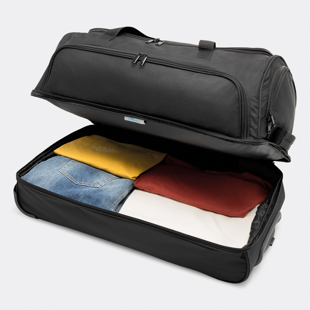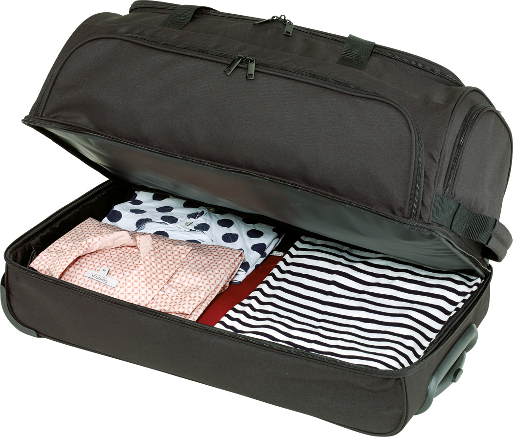 Trolley-Reisetasche BERGEN: 2 Tragegriffe mit Klettverschluss-Verstärkung, 1 Reißverschluss-Vorfach, 2 getrennte Packebenen mit Reißverschluss, 1 seitliches Reißverschluss-Fach, gepolsterter Tragegriff, versenkbares Trolleygestell, 2 Leichtlauf-Skaterrollen mit Kantenschutz, 2 Gleitschienen für Treppentransport und Bodenfüße