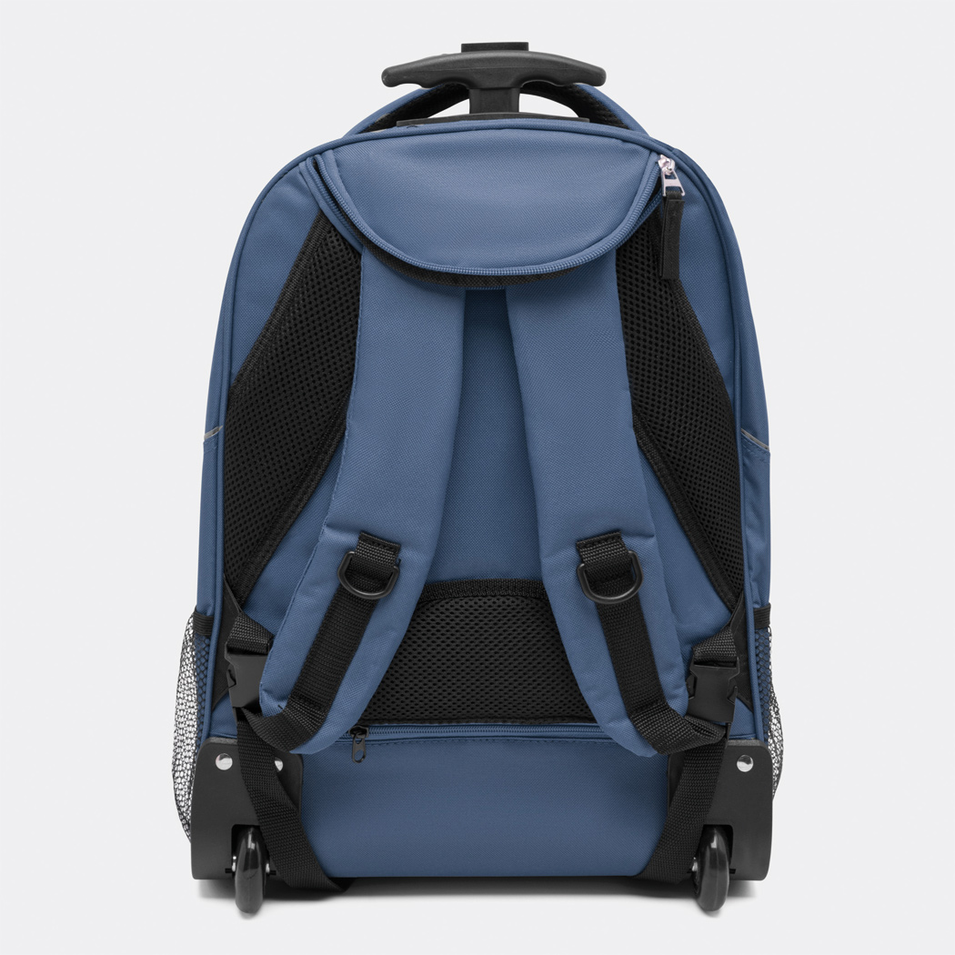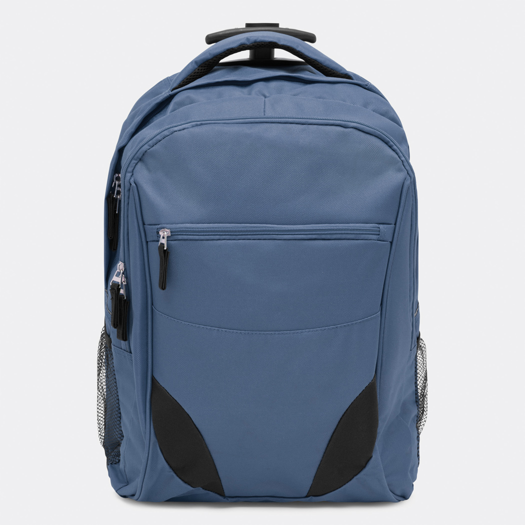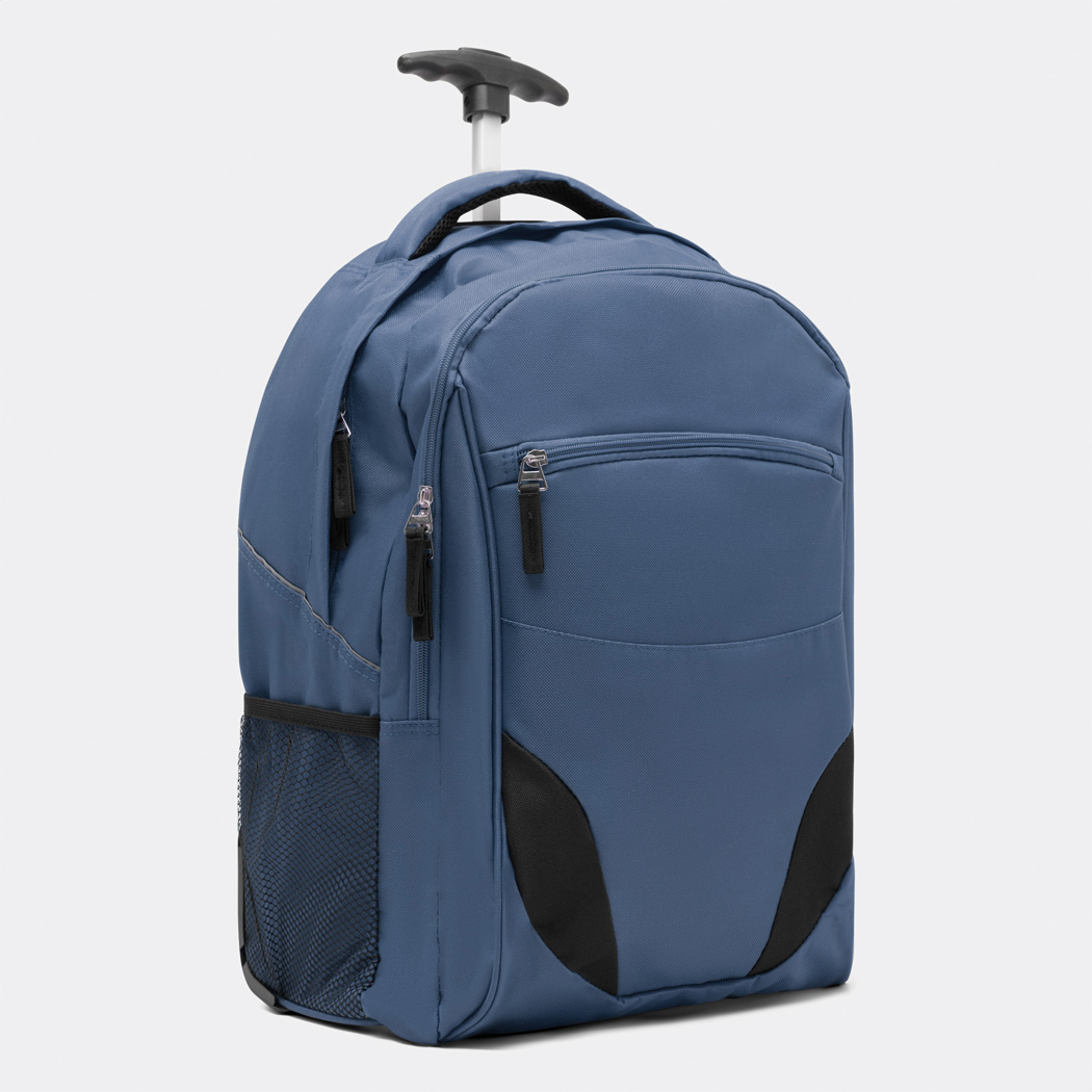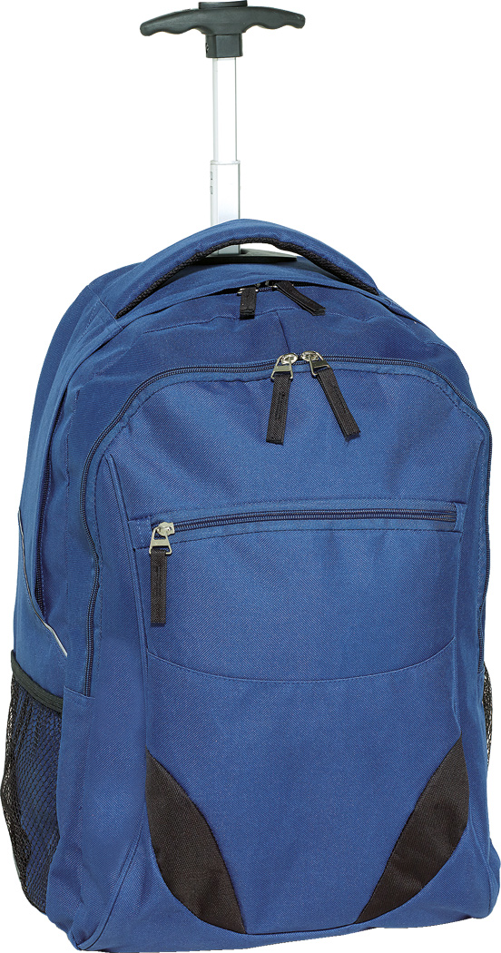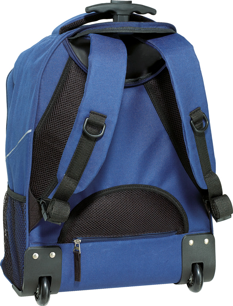 Trolley-Rucksack TRAILER: kleine Reißverschluss-Vortasche, große Reißverschluss-Vortasche mit Organizer, Reißverschluss-Hauptfach mit gepolstertem Laptopfach, 2 seitliche Netzfächer, gepolsterter Rücken und Schultergurte, Reißverschluss-Fach zum Verstauen der Schultergurte, mit Einhand-Teleskopgestell, Tragegriff, 2 leichtlaufende Skaterrollen inkl. Kleiderschutz