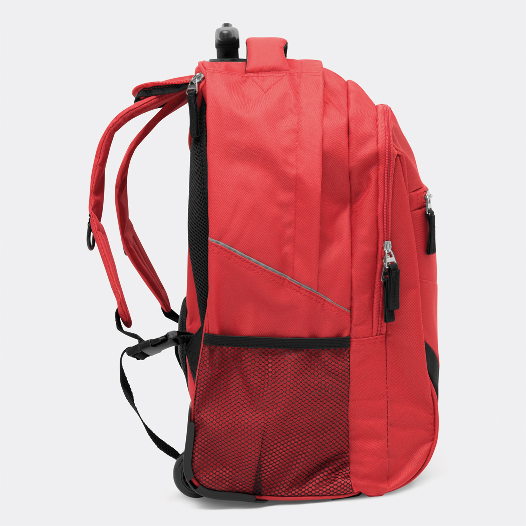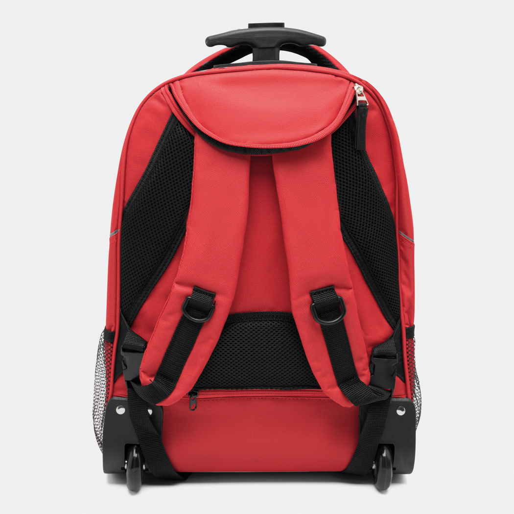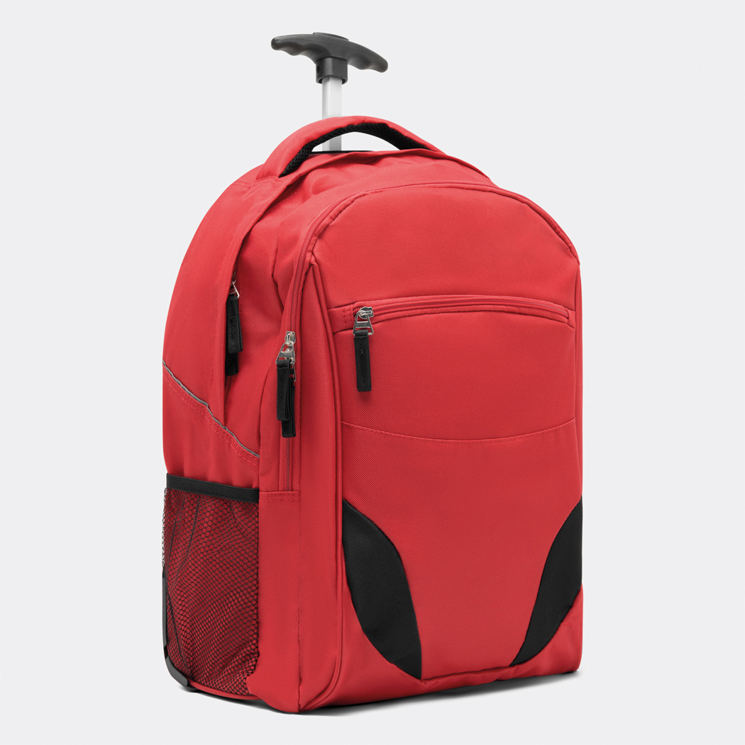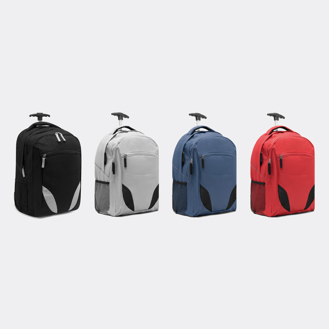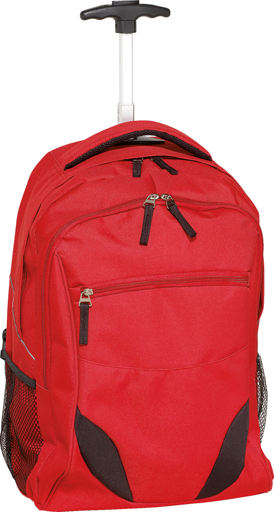 Trolley-Rucksack TRAILER: kleine Reißverschluss-Vortasche, große Reißverschluss-Vortasche mit Organizer, Reißverschluss-Hauptfach mit gepolstertem Laptopfach, 2 seitliche Netzfächer, gepolsterter Rücken und Schultergurte, Reißverschluss-Fach zum Verstauen der Schultergurte, mit Einhand-Teleskopgestell, Tragegriff, 2 leichtlaufende Skaterrollen inkl. Kleiderschutz