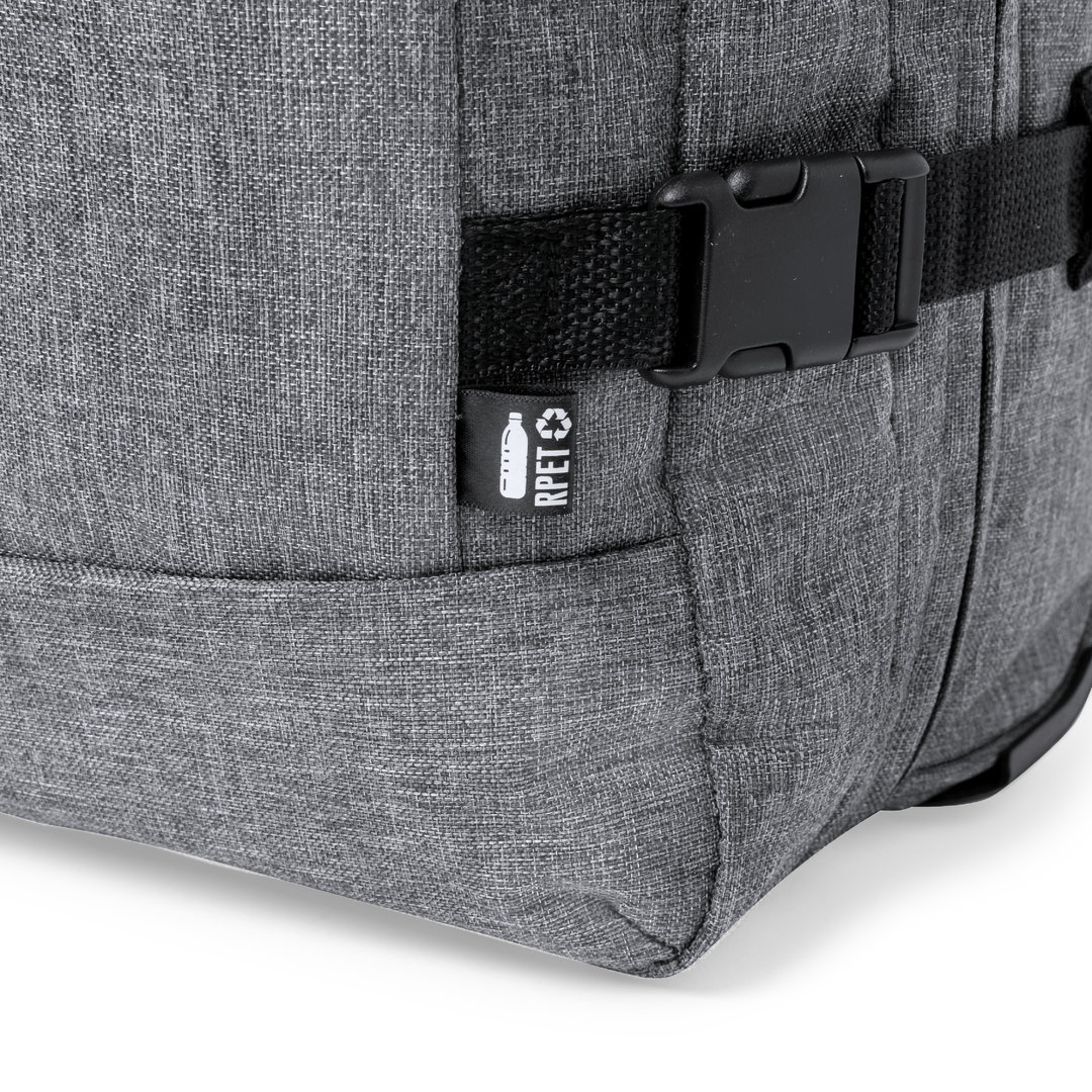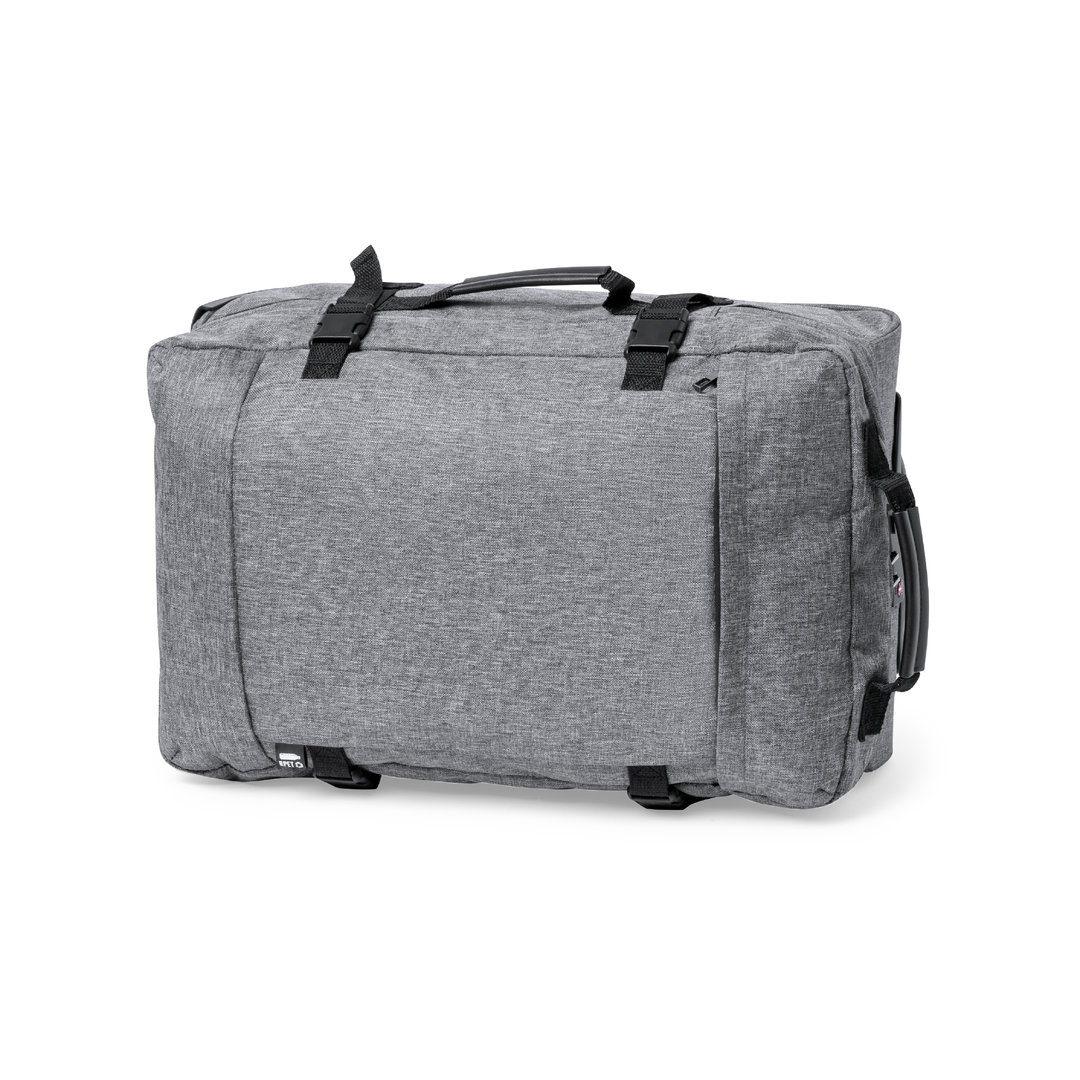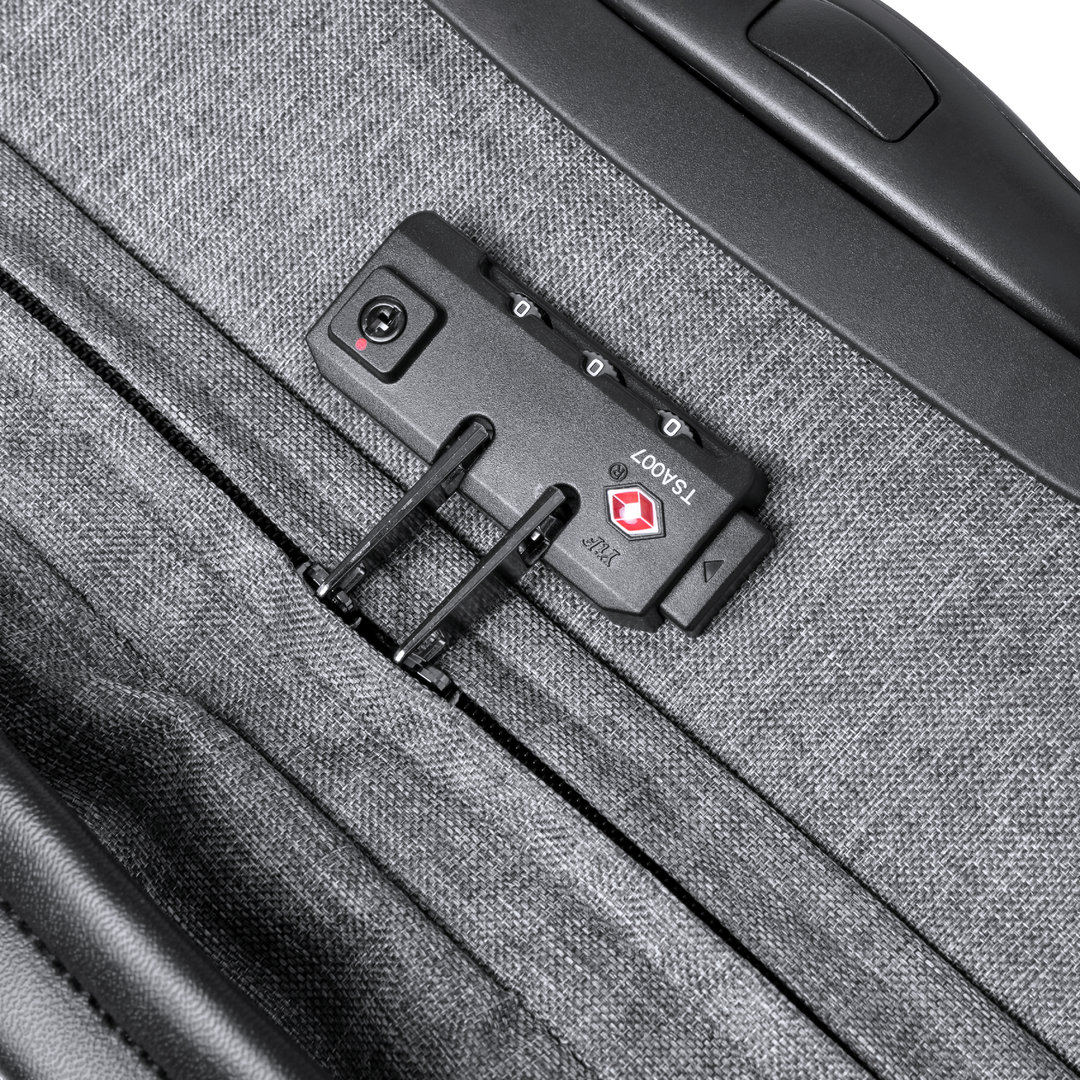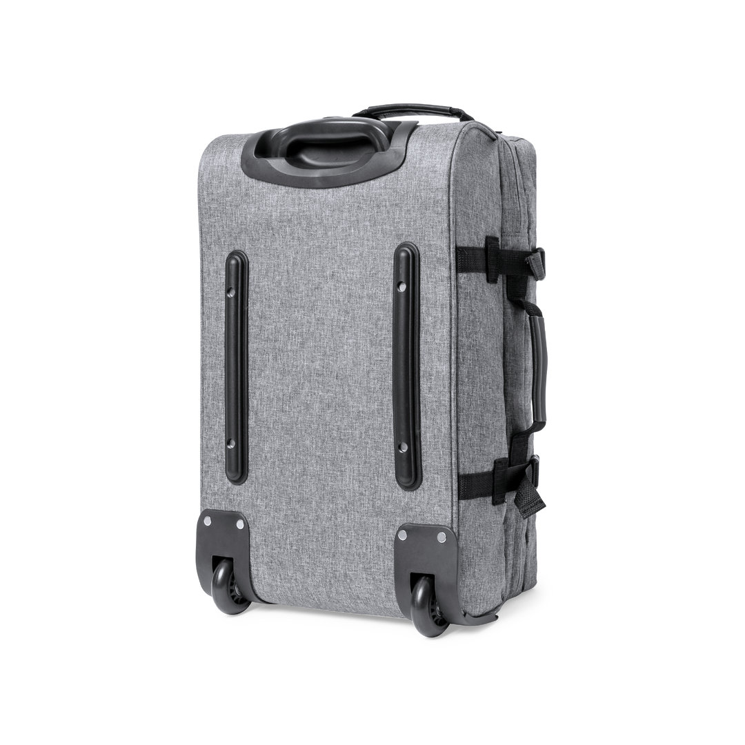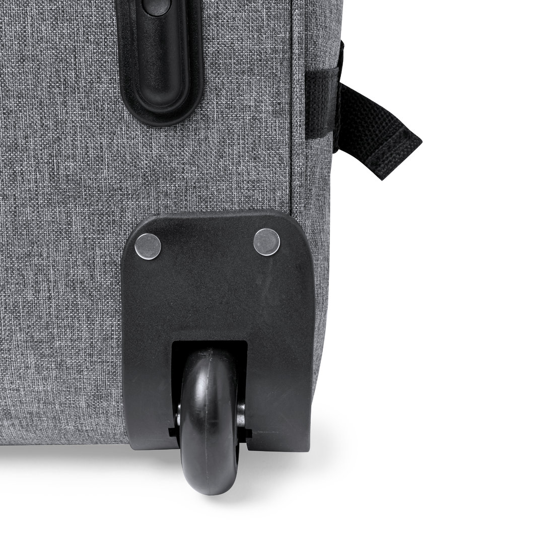 Linie Natur Trolley aus strapazierfähigem 300D RPET. Hauptfach mit Doppelreißverschluss nach TSA-Standard (Transportation Security Administration), der es den Zollbehörden ermöglicht, den Inhalt des Gepäcks zu kontrollieren, ohne den Verschluss gewaltsam öffnen zu müssen, und zwar mit einem speziellen Schlüssel, der den Behörden zur Verfügung steht. Gefütterter Innenraum mit elastischen Verschlussbändern. Außenseite mit 2 verstellbaren Riemen, Schnallenverschlüssen, Vordertasche mit unsichtbarem Reißverschluss und 2 gepolsterten Tragegriffen. Schwarzer Metall-Ausziehmechanismus mit bequemem Tragegriff und 2 Rädern. RPET-Emblem auf dem Außenetikett.