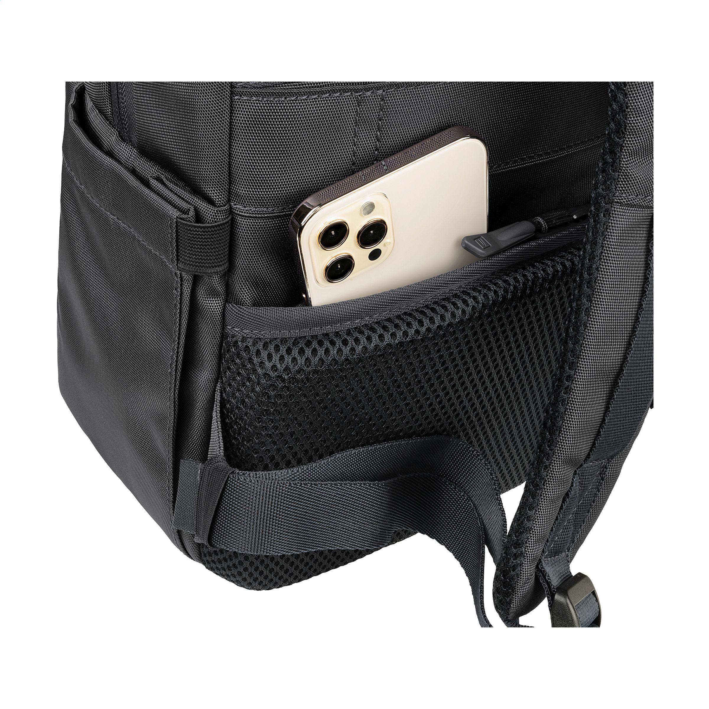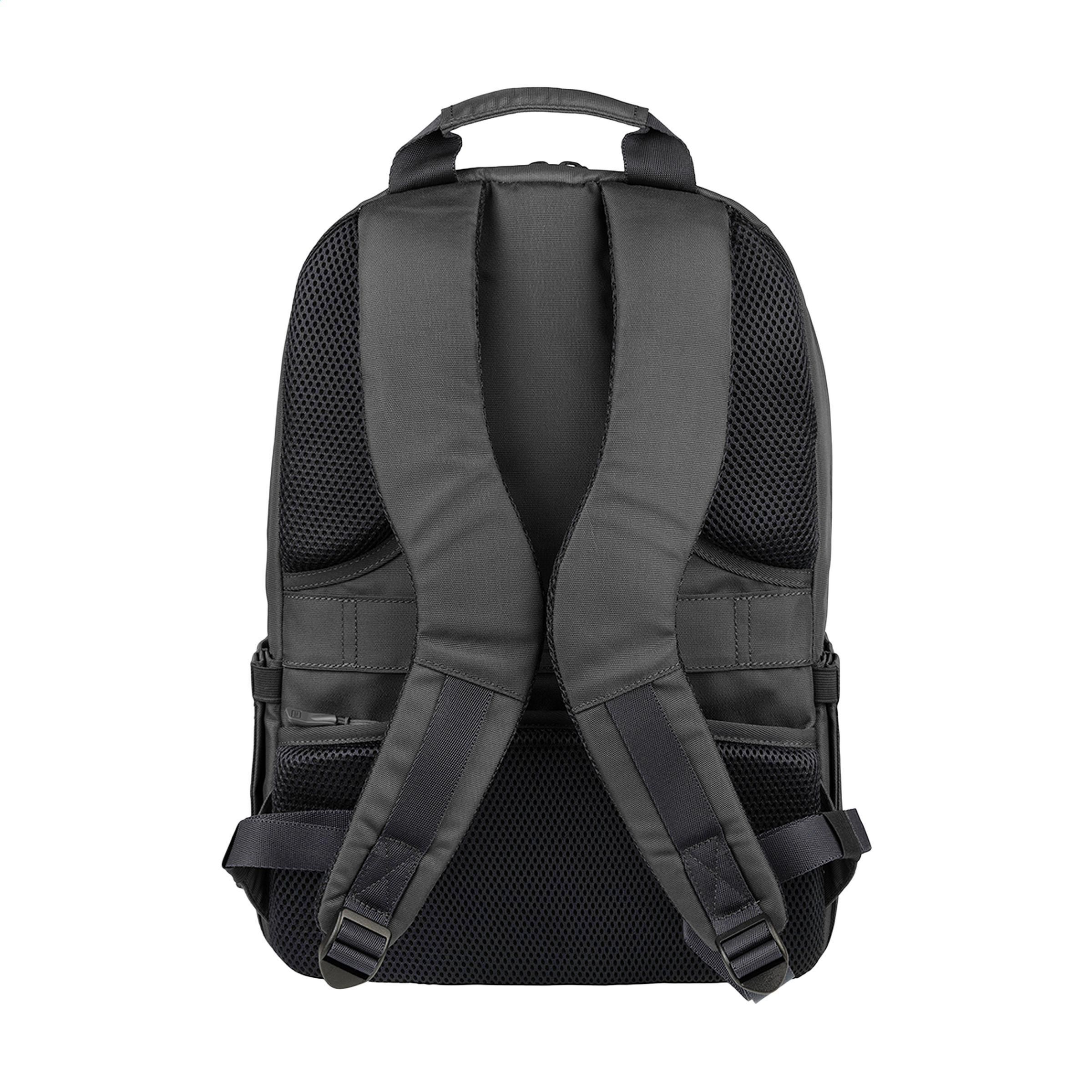 Eleganter Laptop-Rucksack der italienischen Marke Tucano, hergestellt aus recyceltem Kunststoff, darunter 22 recycelte PET-Flaschen. Das gepolsterte Innere verfügt über 2 Fächer. Ein Fach ist mit einem stoßfesten Fach für Laptops bis zu 15,6 Zoll oder MacBook Pro 16 Zoll und einem Netzfach mit Reißverschluss ausgestattet. Das andere Fach verfügt über ein stoßfestes Fach für ein Tablet und zwei Netz-Einsteckfächer. Mit Reißverschlussfach an der Vorderseite, Seitentaschen für eine Trinkflasche und einen Regenschirm sowie einem praktischen Trolley-Gurt. Komplett gefüttert. Die verstellbaren, gepolsterten Schultergurte und der ergonomische Rücken mit zusätzlichem Reißverschlussfach sorgen für zusätzlichen Tragekomfort. Ein idealer Rucksack für den geschäftlichen Einsatz. Fassungsvermögen ca. 20 Liter.