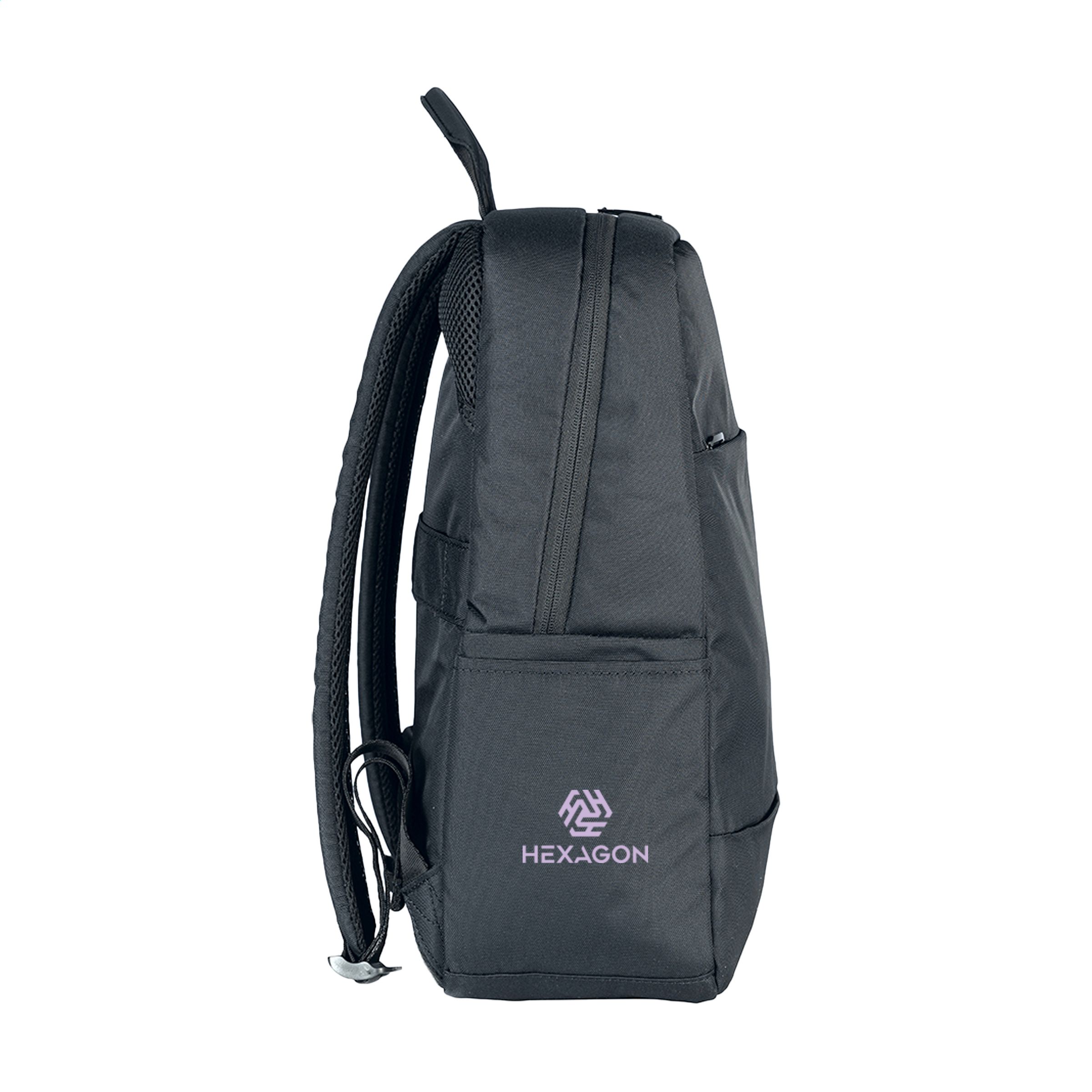 Leichter Laptop-Rucksack der italienischen Marke Tucano. Der moderne, kompakte Rucksack ist aus recyceltem Kunststoff hergestellt, darunter 12 recycelte PET-Flaschen. Das geräumige Fach ist mit einem Netzfach mit Reißverschluss ausgestattet und verfügt über ein stoßfestes Fach für Laptops bis zu 15,6 Zoll oder MacBook Pro 16 Zoll. Das Reißverschlussfach auf der Vorderseite verfügt über einen Organizer für Karten, Handy und Stifte. Komplett gefüttert. Die verstellbaren, gepolsterten Schultergurte und die ergonomische Rückseite sorgen für zusätzlichen Tragekomfort. Mit praktischem Trolley-Gurt und Seitentaschen für eine Trinkflasche und einen Regenschirm. Ein praktischer Rucksack für Arbeit und Freizeit. Fassungsvermögen ca. 20 Liter.