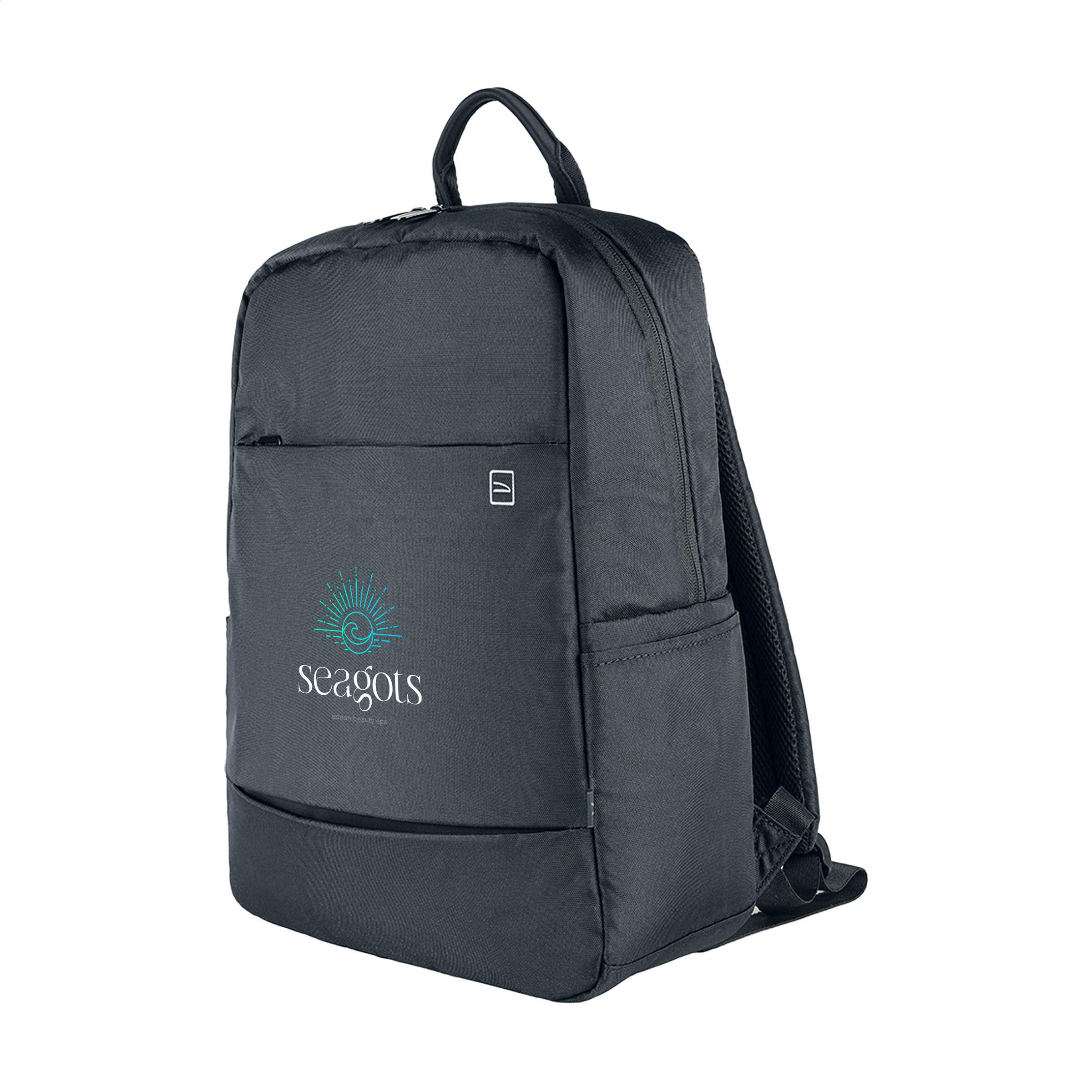 Leichter Laptop-Rucksack der italienischen Marke Tucano. Der moderne, kompakte Rucksack ist aus recyceltem Kunststoff hergestellt, darunter 12 recycelte PET-Flaschen. Das geräumige Fach ist mit einem Netzfach mit Reißverschluss ausgestattet und verfügt über ein stoßfestes Fach für Laptops bis zu 15,6 Zoll oder MacBook Pro 16 Zoll. Das Reißverschlussfach auf der Vorderseite verfügt über einen Organizer für Karten, Handy und Stifte. Komplett gefüttert. Die verstellbaren, gepolsterten Schultergurte und die ergonomische Rückseite sorgen für zusätzlichen Tragekomfort. Mit praktischem Trolley-Gurt und Seitentaschen für eine Trinkflasche und einen Regenschirm. Ein praktischer Rucksack für Arbeit und Freizeit. Fassungsvermögen ca. 20 Liter.