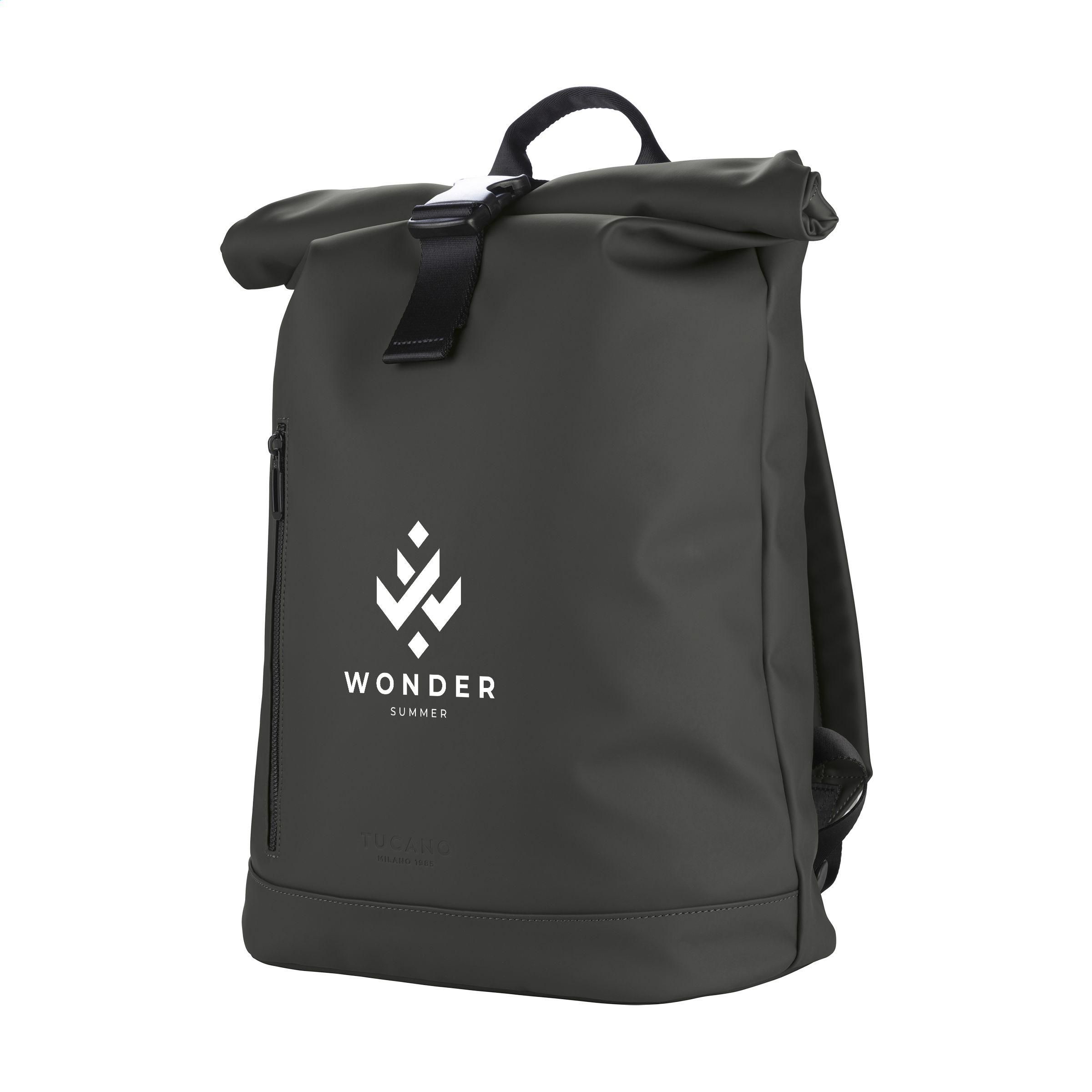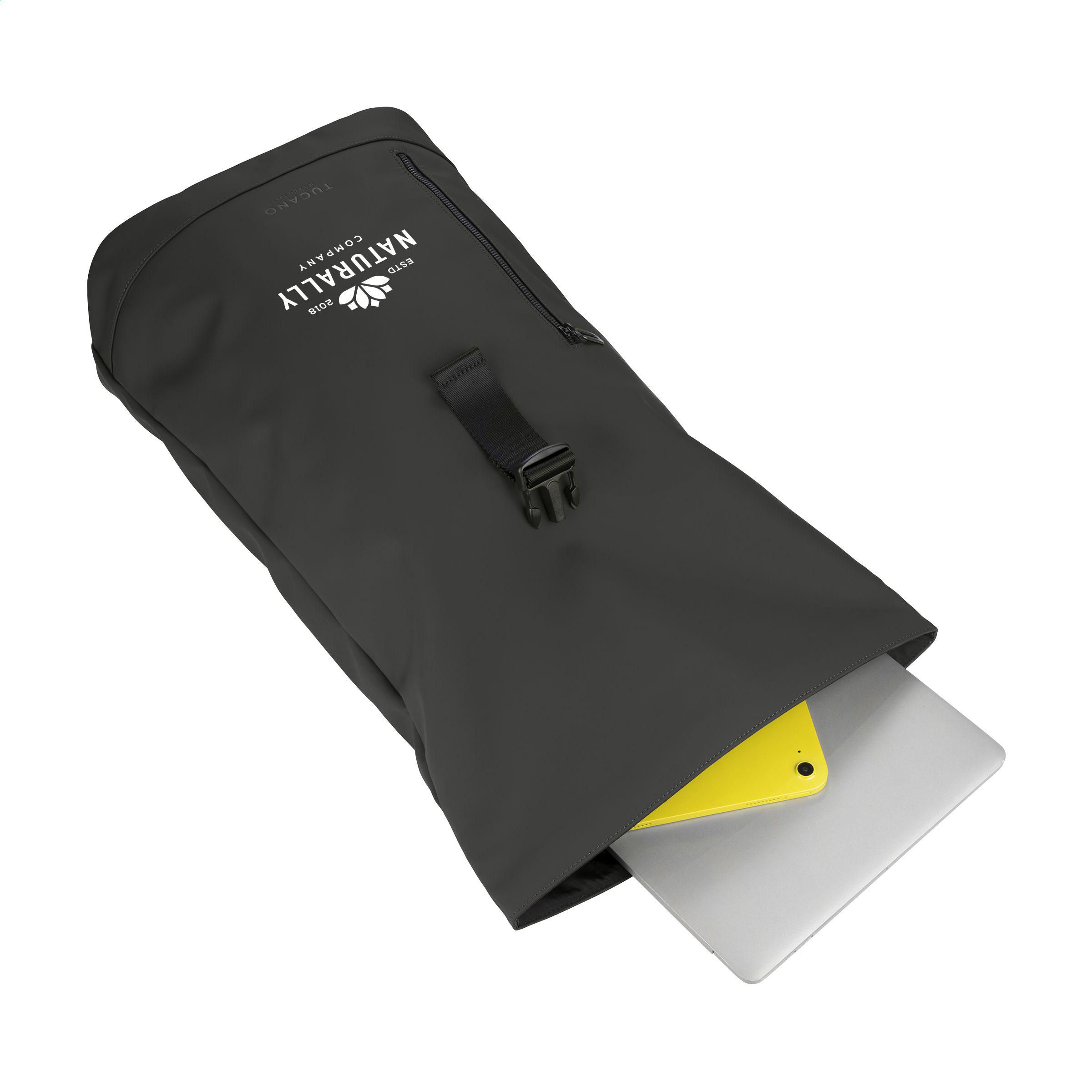 Sportlicher 'Rolltop'-Rucksack mit robustem Kunststoffverschluss der italienischen Marke Tucano. Hergestellt aus gummiartigen Materialien, die aus recyceltem Kunststoff, darunter 22 recycelte PET-Flaschen, hergestellt werden. Das wasserabweisende Material an der Außenseite ist überraschend geschmeidig und verleiht der Tasche einen eleganten und modernen Look. Ausgestattet mit einem großen Einzelfach mit einem internen, stoßfesten Laptopfach (bis zu 15,6 Zoll oder MacBook Pro 16 Zoll) mit einem Netzfach und einem geräumigen Reißverschlussfach an der Vorderseite für wichtige Accessoires. Komplett gefüttert. Die verstellbaren, gepolsterten Schultergurte und die atmungsaktive Netzrückseite sorgen für zusätzlichen Tragekomfort. Mit Trolley-Gurt und Trageschlaufe. PVC-frei. Ein idealer Rucksack für den täglichen Gebrauch. Fassungsvermögen ca. 22,5 Liter.