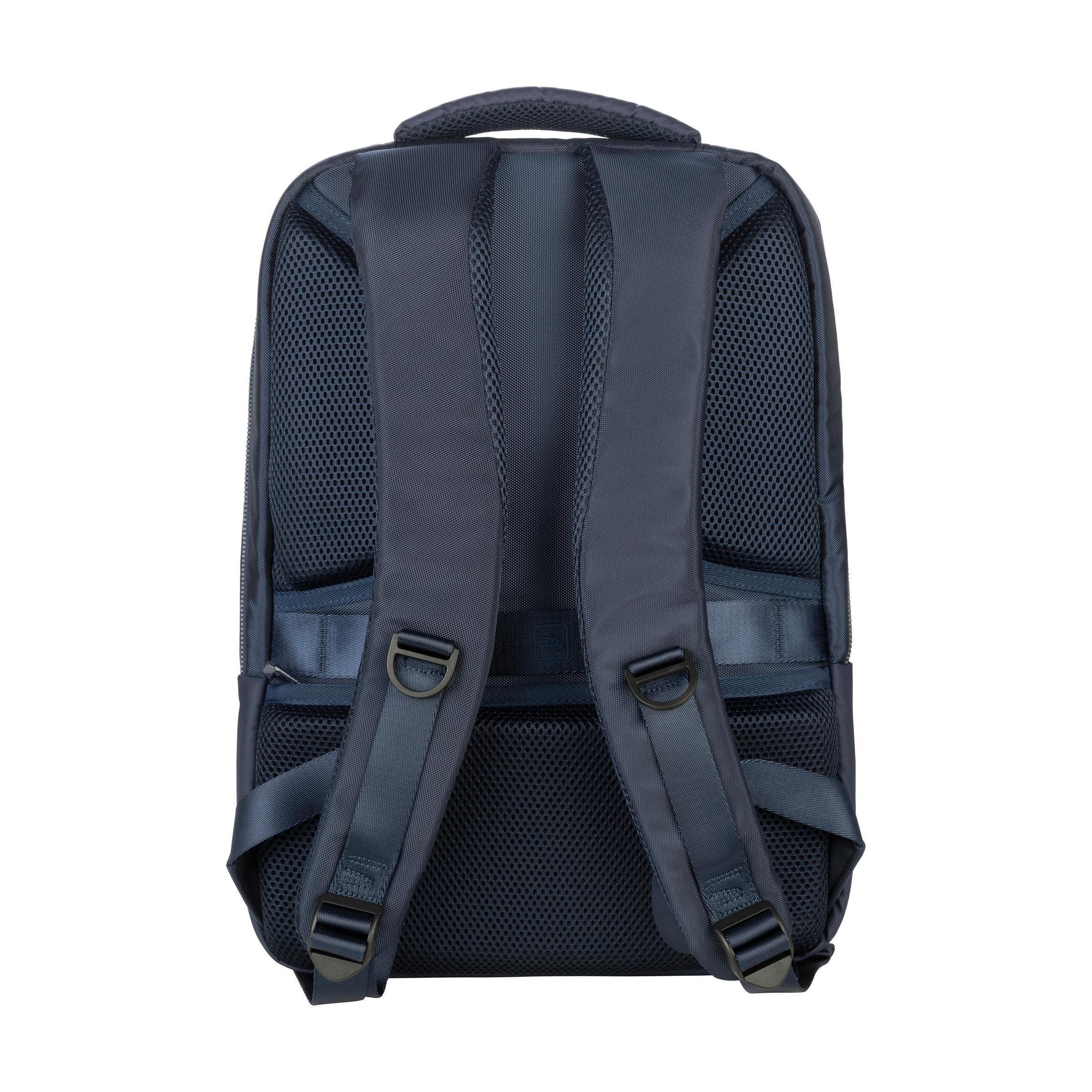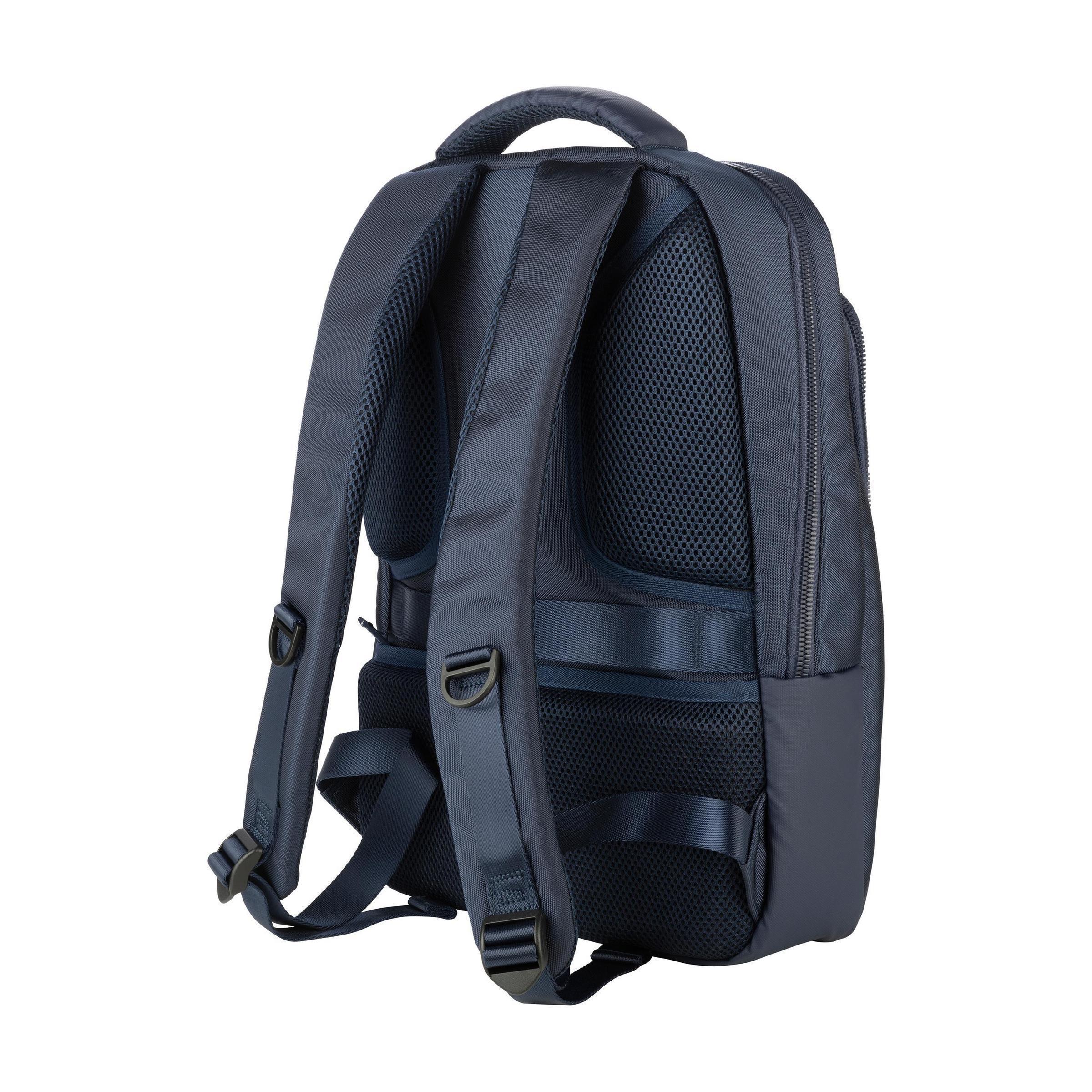 Laptop-Rucksack der italienischen Marke Tucano. Der moderne, kompakte Rucksack ist aus recyceltem Kunststoff hergestellt, darunter 20 recycelte PET-Flaschen. Das geräumige Fach ist mit einem Netzfach mit Reißverschluss ausgestattet und verfügt über ein stoßfestes Fach für Laptops bis zu 15,6 Zoll oder MacBook Pro 16 Zoll. Die Reißverschlussfächer an der Vorderseite, eines davon mit zwei Einsteckfächern, eignen sich zur Aufbewahrung von Accessoires, die Sie schnell zur Hand haben möchten. Auf der Rückseite befindet sich ein verstecktes Reißverschlussfach für den sicheren Transport von persönlichen Gegenständen und Reisedokumenten. Komplett gefüttert. Die verstellbaren, gepolsterten Schultergurte und die ergonomisch geformte Rückseite sind mit atmungsaktivem Mesh ausgestattet und sorgen für zusätzlichen Tragekomfort. Mit praktischem Trolley-Gurt und auffälligen, hochwertigen Reißverschlüssen. Fassungsvermögen ca. 17 Liter.
