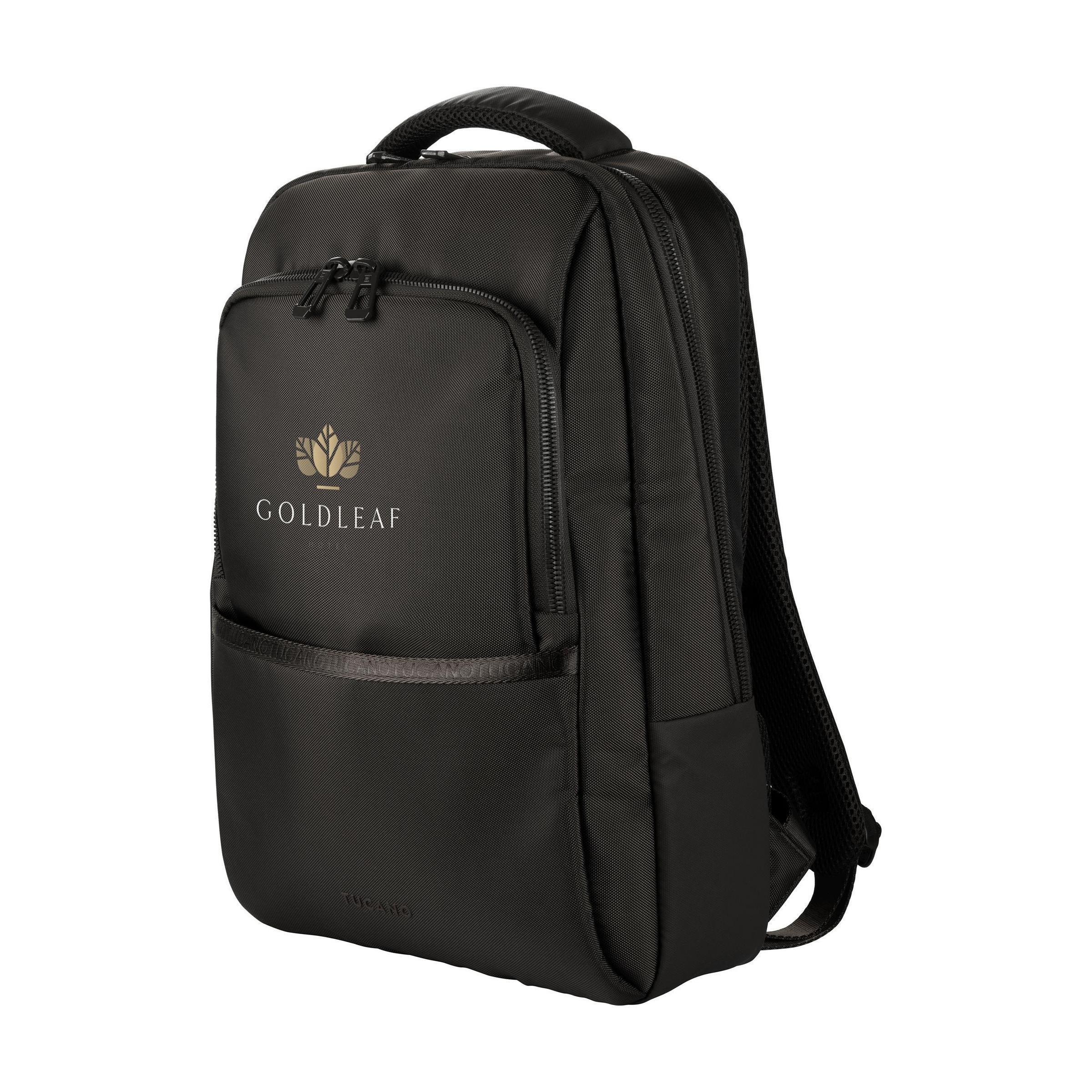 Laptop-Rucksack der italienischen Marke Tucano. Der moderne, kompakte Rucksack ist aus recyceltem Kunststoff hergestellt, darunter 20 recycelte PET-Flaschen. Das geräumige Fach ist mit einem Netzfach mit Reißverschluss ausgestattet und verfügt über ein stoßfestes Fach für Laptops bis zu 15,6 Zoll oder MacBook Pro 16 Zoll. Die Reißverschlussfächer an der Vorderseite, eines davon mit zwei Einsteckfächern, eignen sich zur Aufbewahrung von Accessoires, die Sie schnell zur Hand haben möchten. Auf der Rückseite befindet sich ein verstecktes Reißverschlussfach für den sicheren Transport von persönlichen Gegenständen und Reisedokumenten. Komplett gefüttert. Die verstellbaren, gepolsterten Schultergurte und die ergonomisch geformte Rückseite sind mit atmungsaktivem Mesh ausgestattet und sorgen für zusätzlichen Tragekomfort. Mit praktischem Trolley-Gurt und auffälligen, hochwertigen Reißverschlüssen. Fassungsvermögen ca. 17 Liter.