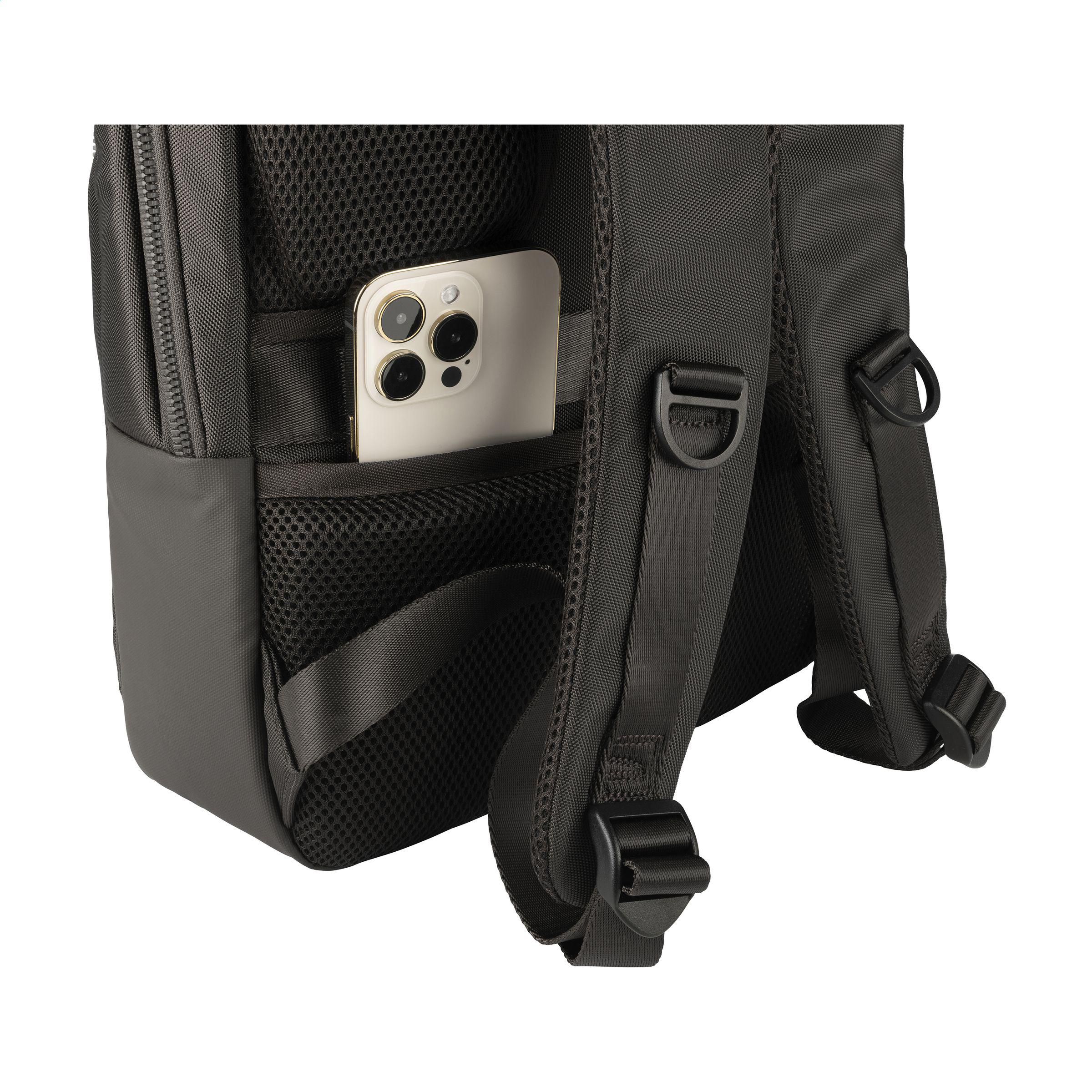 Laptop-Rucksack der italienischen Marke Tucano. Der moderne, kompakte Rucksack ist aus recyceltem Kunststoff hergestellt, darunter 20 recycelte PET-Flaschen. Das geräumige Fach ist mit einem Netzfach mit Reißverschluss ausgestattet und verfügt über ein stoßfestes Fach für Laptops bis zu 15,6 Zoll oder MacBook Pro 16 Zoll. Die Reißverschlussfächer an der Vorderseite, eines davon mit zwei Einsteckfächern, eignen sich zur Aufbewahrung von Accessoires, die Sie schnell zur Hand haben möchten. Auf der Rückseite befindet sich ein verstecktes Reißverschlussfach für den sicheren Transport von persönlichen Gegenständen und Reisedokumenten. Komplett gefüttert. Die verstellbaren, gepolsterten Schultergurte und die ergonomisch geformte Rückseite sind mit atmungsaktivem Mesh ausgestattet und sorgen für zusätzlichen Tragekomfort. Mit praktischem Trolley-Gurt und auffälligen, hochwertigen Reißverschlüssen. Fassungsvermögen ca. 17 Liter.
