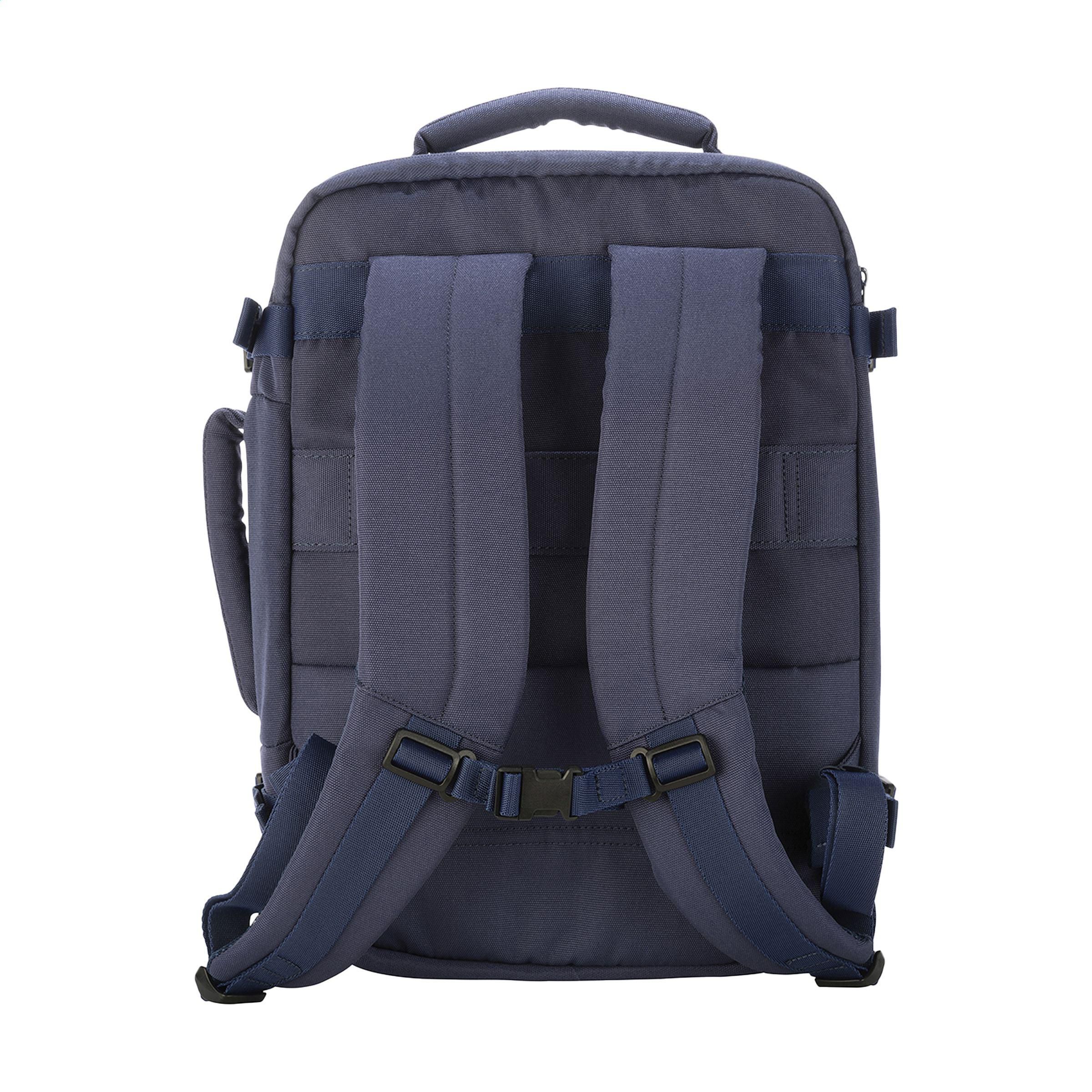 Handgepäckrucksack der italienischen Marke Tucano. Dieser Rucksack erfüllt die Größenanforderungen aller Billigfluggesellschaften. Der Rucksack besteht aus recycelten Kunststoffen, darunter 24 recycelte PET-Flaschen. Das Hauptfach ist groß und geräumig, ideal für Kleidung und Accessoires. Der Reißverschluss ist mit abschließbaren Reißverschlusszügen versehen, sodass Sie das Hauptfach mit jedem dafür geeigneten Vorhängeschloss (nicht im Lieferumfang enthalten) verschließen können. Darüber hinaus verfügt der Rucksack über ein internes AirTag-Gehäuse. Das gepolsterte, stoßfeste Rückfach ist für den Transport von Laptops bis zu 15,6 Zoll oder MacBook Pro 16 Zoll geeignet. Komplett gefüttert. Die verstellbaren, gepolsterten Schultergurte und die gepolsterte Rückseite sorgen für zusätzlichen Tragekomfort. Mit praktischem Trolley-Gurt und zusätzlichem Reißverschlussfach auf der Rückseite, ideal zum Verstauen persönlicher Dokumente. Genießen Sie perfekte Tragbarkeit mit zwei Griffen, einem oben und einem an der Seite. Dieser Rucksack wurde so konzipiert, dass er den Kabinenabmessungen aller Fluggesellschaften entspricht. Er passt unter den Sitz im Flugzeug und ist somit der ideale Begleiter auf Flugreisen. Fassungsvermögen ca. 23 Liter.