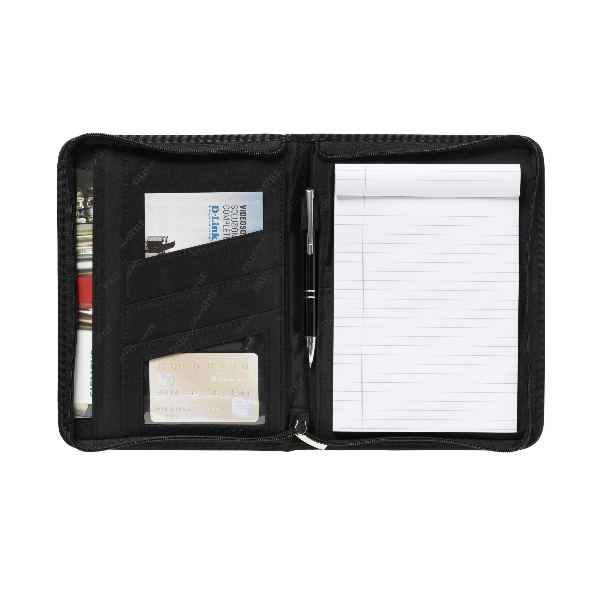 Schreibmappe / Dokumentenmapp aus fein gebundenem Leder, im DIN A5-Format. Mit diversen Einsteckfächern und Rundum-Reißverschluss. Inkl. Schreibblock und Kugelschreiber. Pro Stück in einer Verpackung.