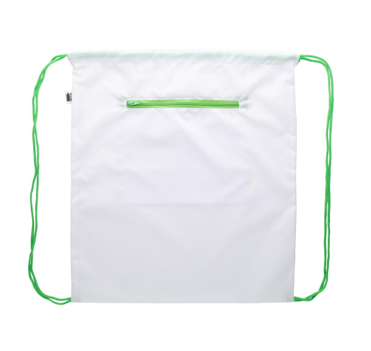 Individueller Turnbeutel mit Kordelzug und Fach mit RFID-Schutz mit Reißverschluss, Material: 190T RPET-Polyester. Der Preis ist inkl. Sublimationsdruck und RPET-Label. Mindestmenge: 25 Stk.