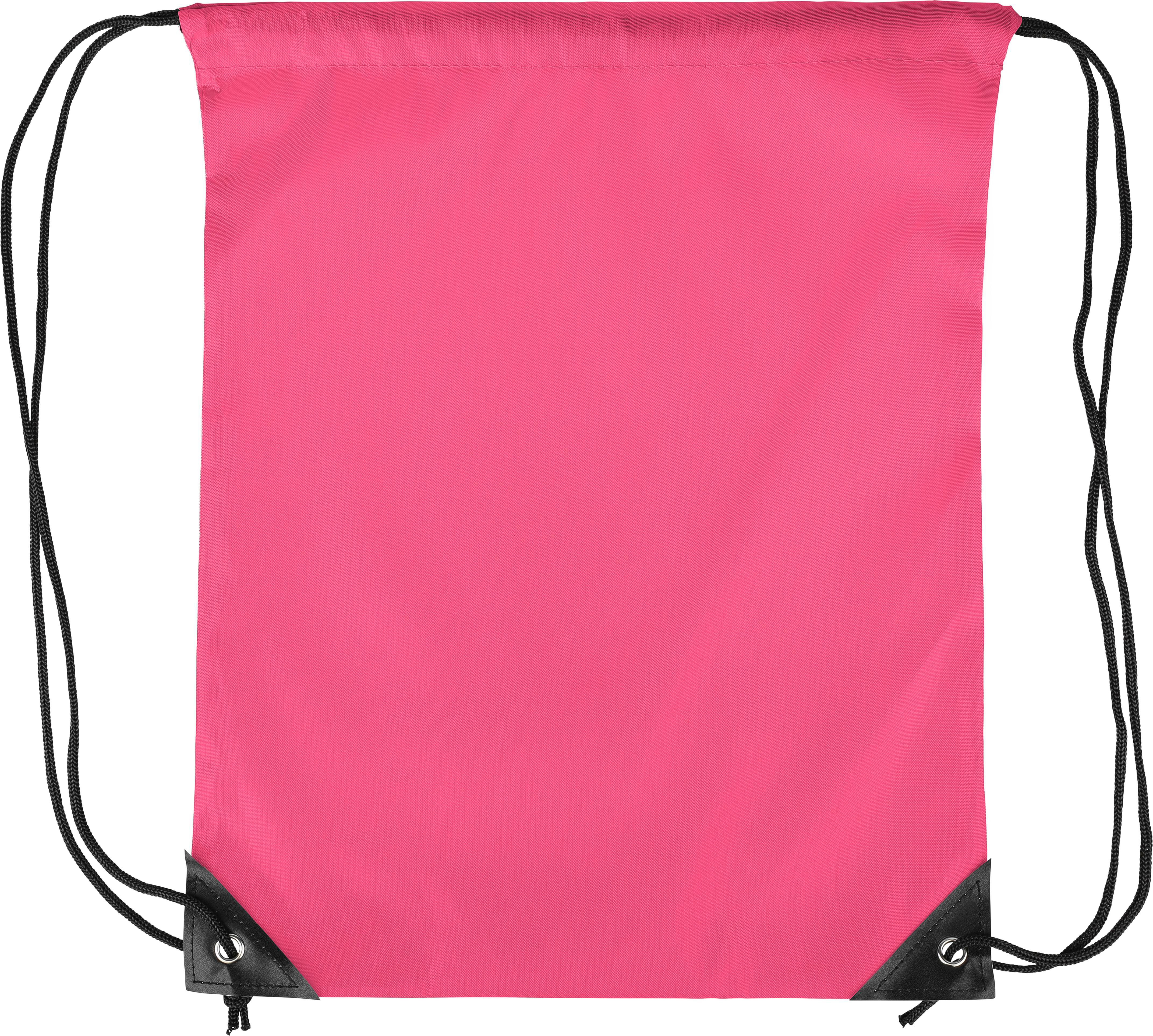 Rucksack aus Polyester 210D mit Kordelzug, zwei schwarzen PU-Ecken auf der Vorderseite und Innennähten. Mit einer schwarzen Nylonschnur auf jeder Seite, Kordelzugverschluss. Fassungsvermögen: 5 Liter. Tragkraft: 7 kg.