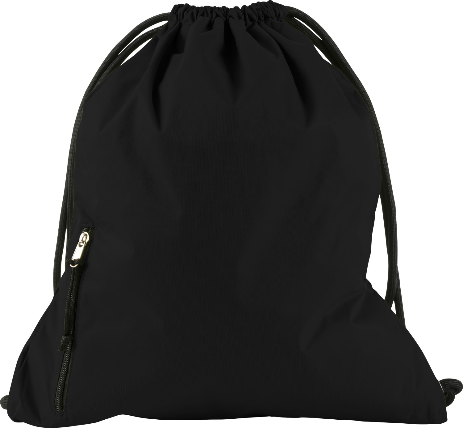 Turnbeutel mit Kordelzug aus Pongee. Die vordere Tasche hat einen Reißverschluss.