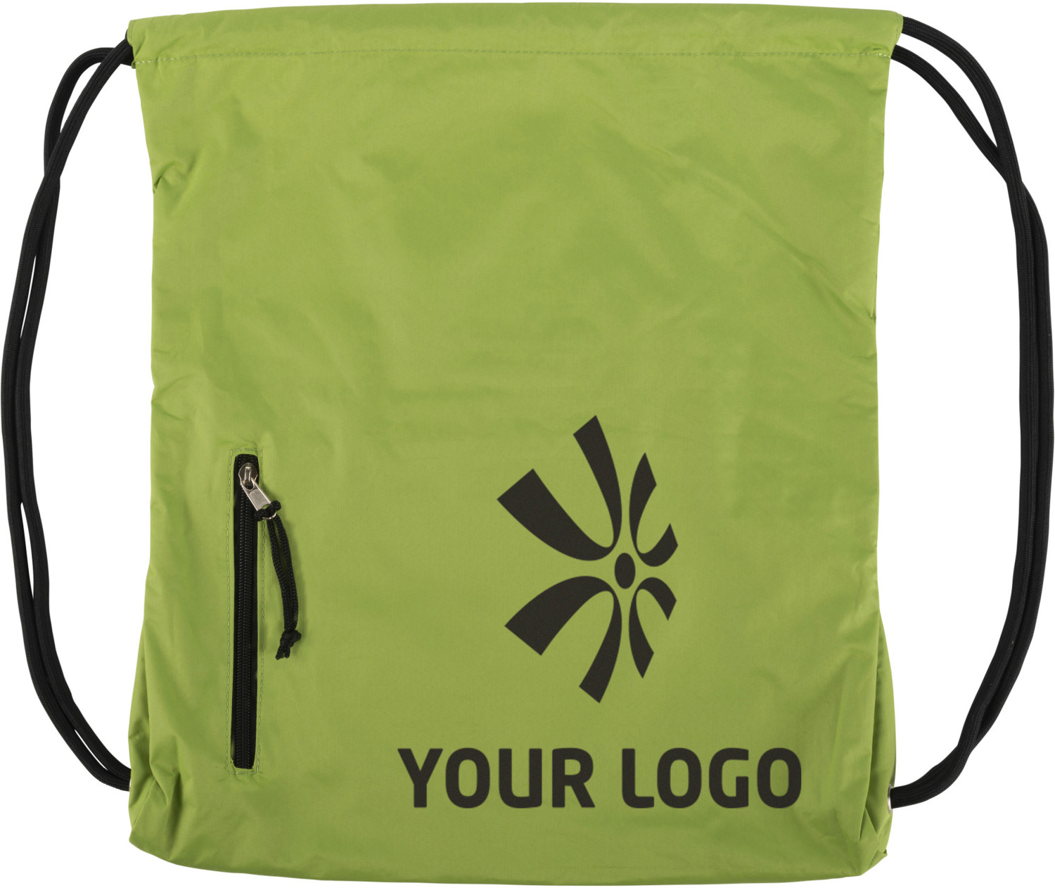 Turnbeutel mit Kordelzug aus Pongee. Die vordere Tasche hat einen Reißverschluss.