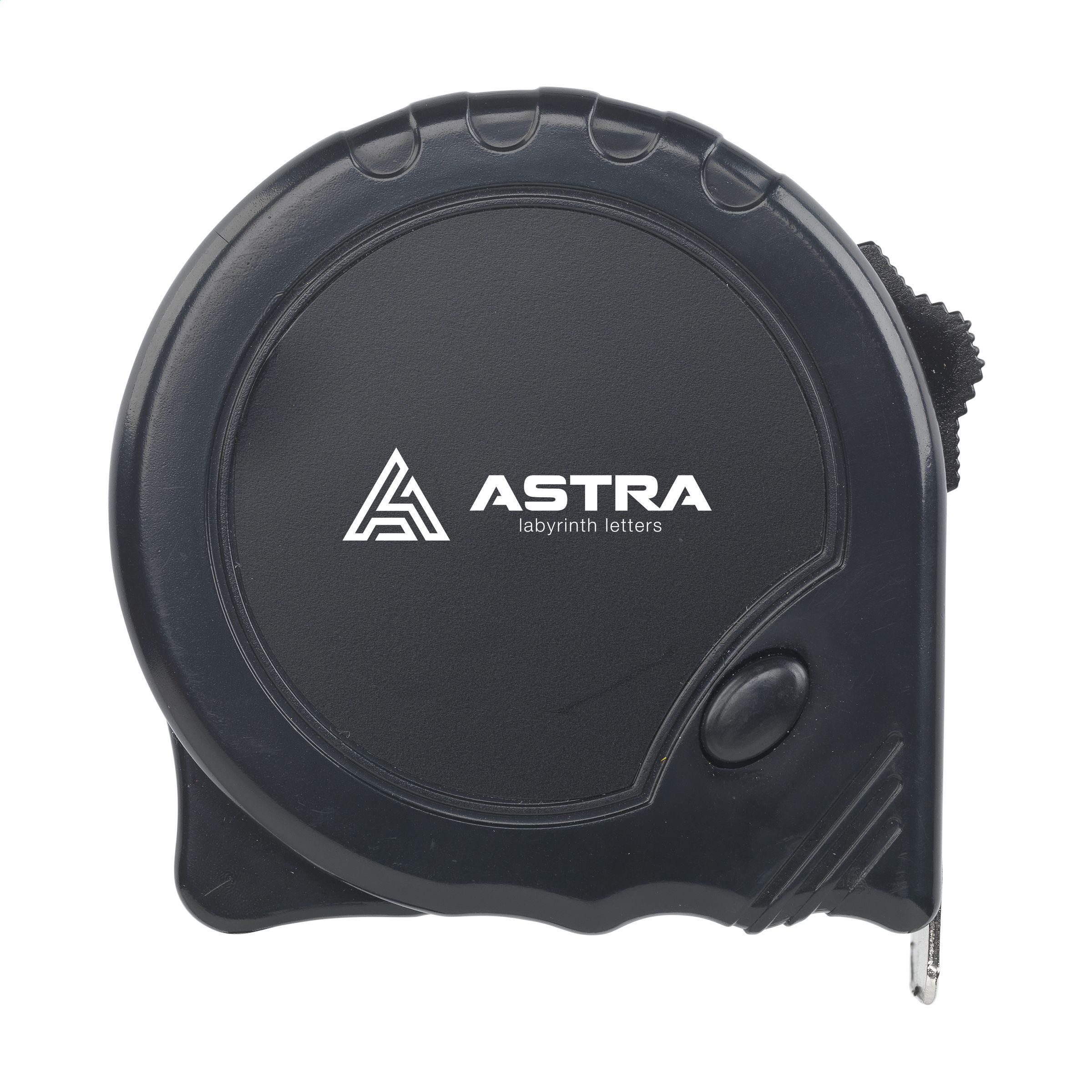 Bandmaß mit einem Gehäuse aus recyceltem ABS-Kunststoff und einem 5 Meter langen und 1,9 cm breiten gehärteten Stahlband. Mit Angabe in Zentimetern, Gürtelclip und Polyester-Handschlaufe. Geeicht nach europäischen Normen. RCS-zertifiziert. Recyceltes Material insgesamt: 14%.