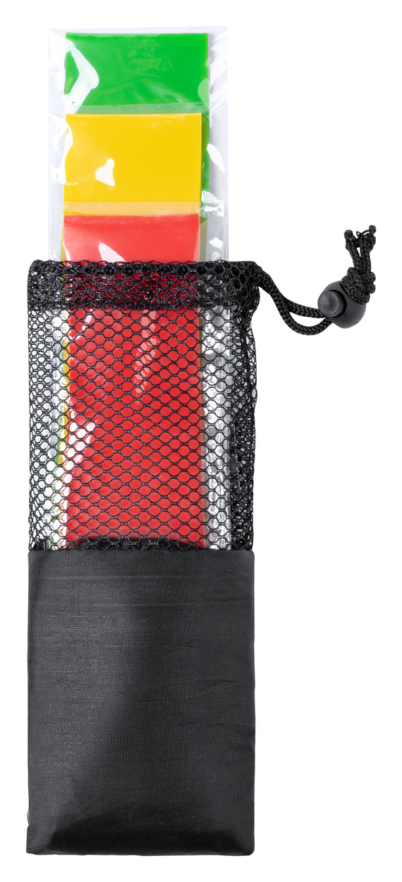 Elastisches Übungsband mit 3 Bändern unterschiedlichen Widerstands (leicht, mittel, schwer), Material: TPE-Gummi. Mit Tragetasche mit Kordelzug.