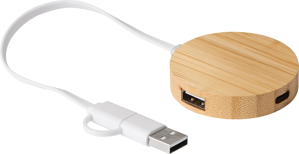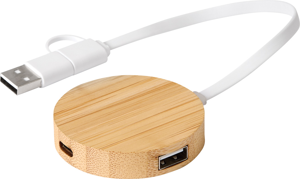 USB Hub MULTIPLIER CIRCLE: im Bambus-Gehäuse, 2 Port USB Typ A und 1 Port USB Typ C, USB Version 2.0, Kabellänge ca. 20,5 cm, kombinierter USB Typ A / Typ C Eingangsstecker, in Box