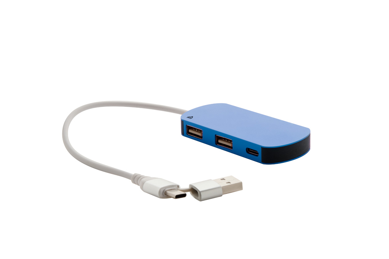 USB-Hub aus recyceltem Aluminium und recyceltem ABS mit 2 USB- und 1 USB-C-Anschluss, USB 2.0. Inklusive Kabel mit USB- und USB-C-Anschlüssen.