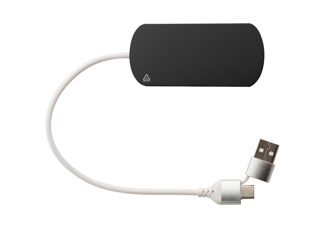 USB-Hub aus recyceltem Aluminium und recyceltem ABS mit 2 USB- und 1 USB-C-Anschluss, USB 2.0. Inklusive Kabel mit USB- und USB-C-Anschlüssen.