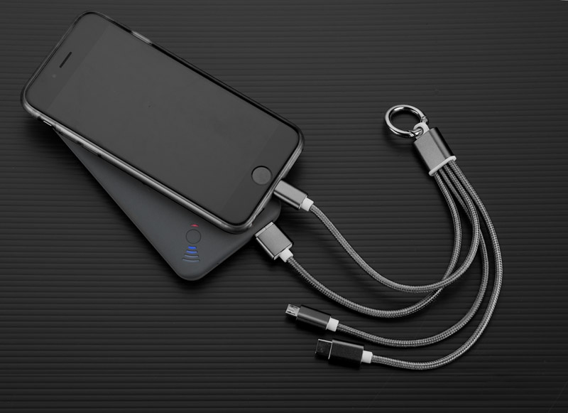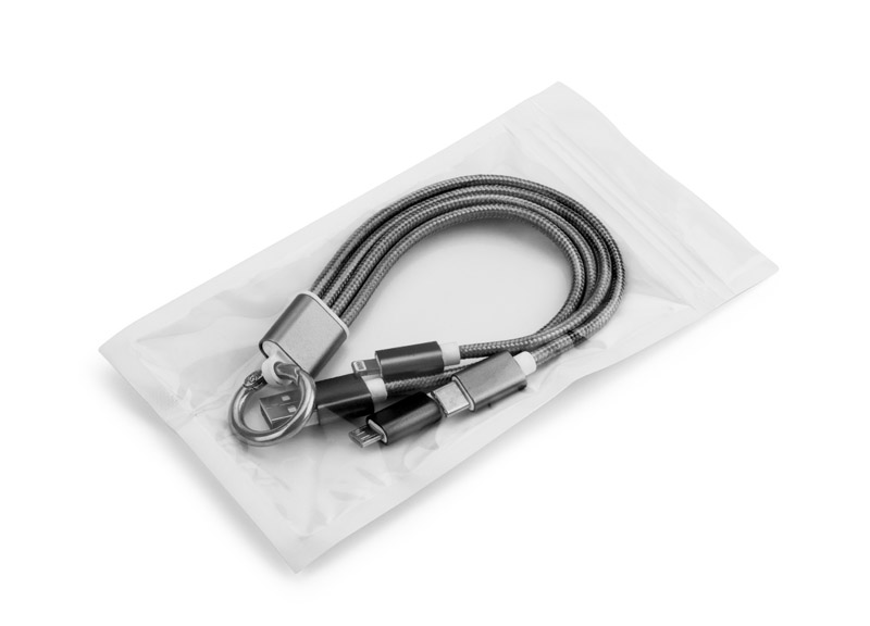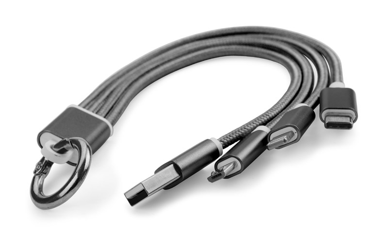 Das 3-in-1-USB-Kabel TAUS zum Laden verschiedener Geräte verfügt über drei Anschlüsse: Micro-USB, Lightning (iPhone) und USB-Typ-C. Das Kabel ist mit Stoff beschichtet und die USB-Anschlüsse bestehen aus Metall. Ein praktisches Gadget für jeden Nutzer mobiler Geräte.